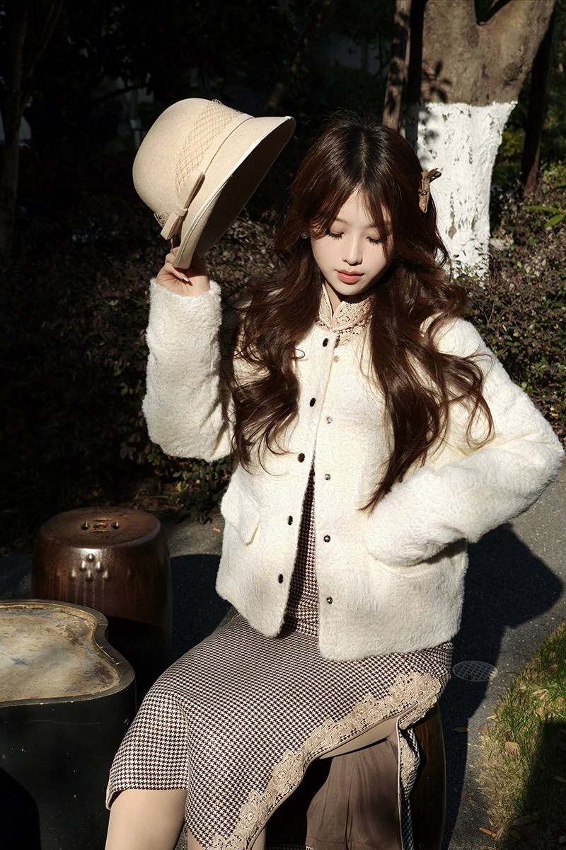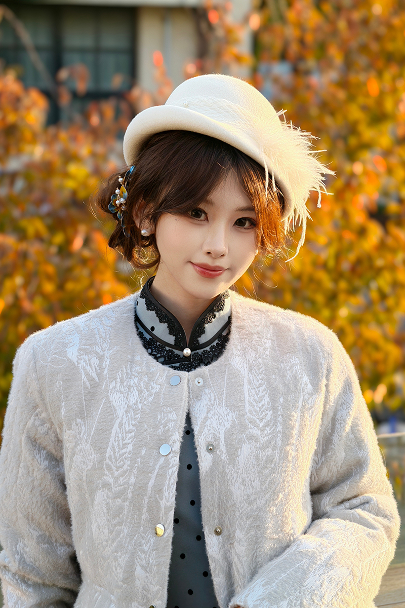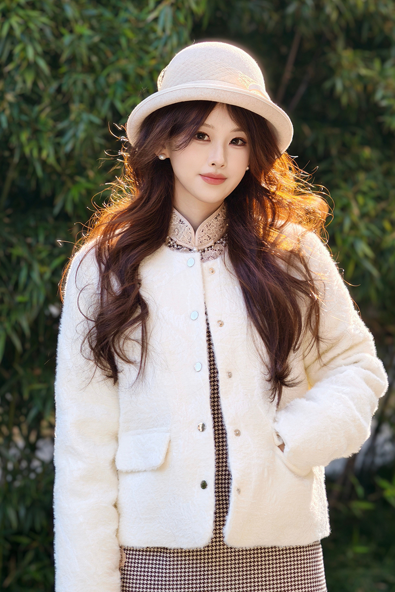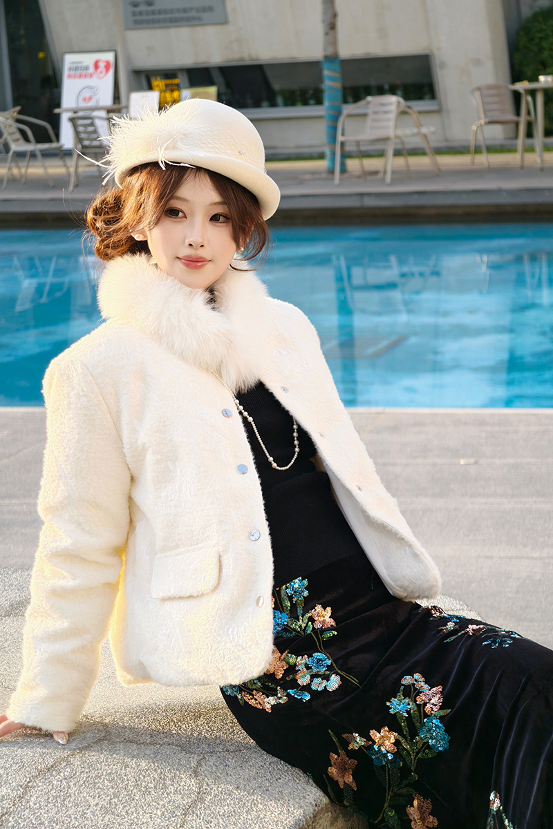恰如其分地露出旗袍立领与盘扣,既不喧宾夺主,又能衬托颈间精致。