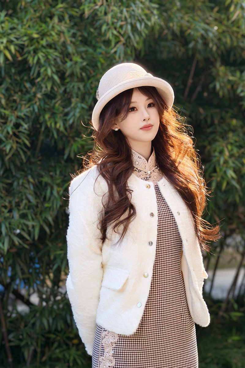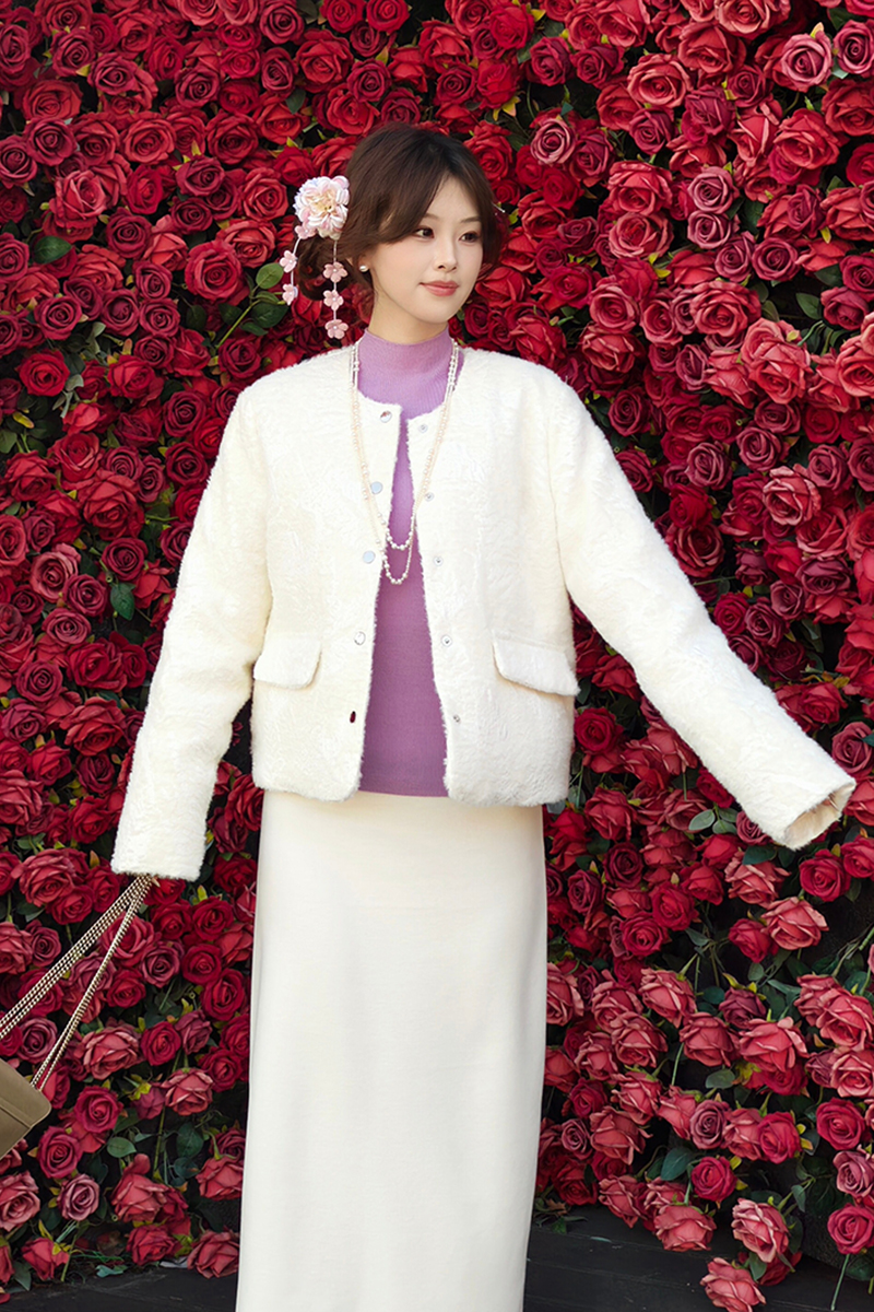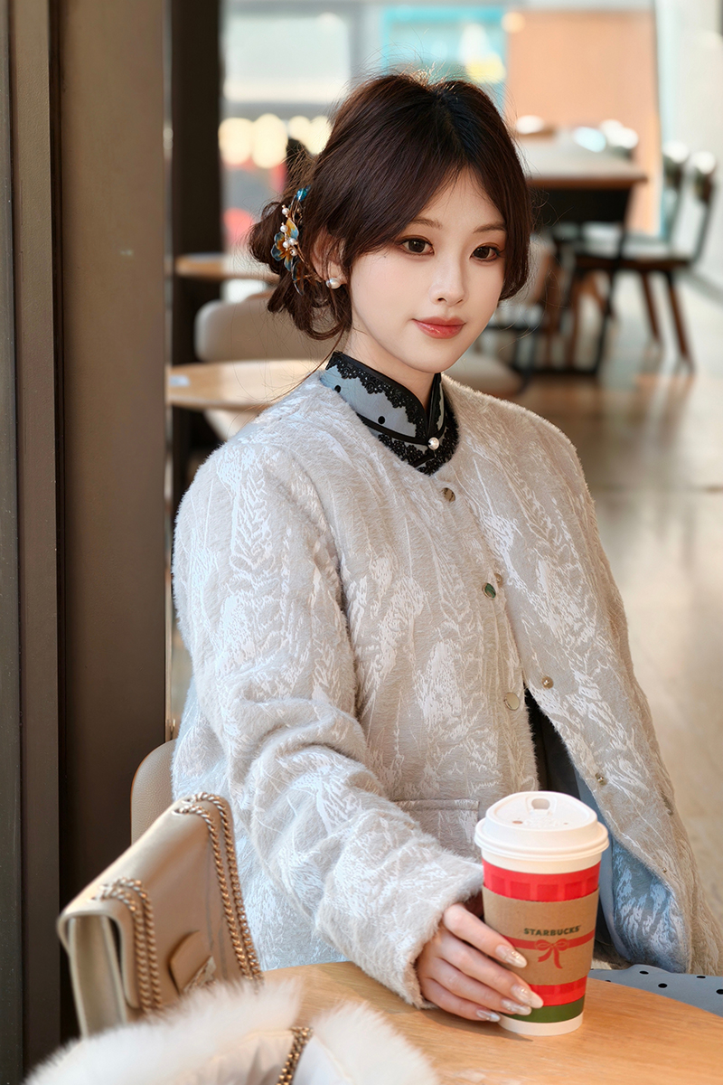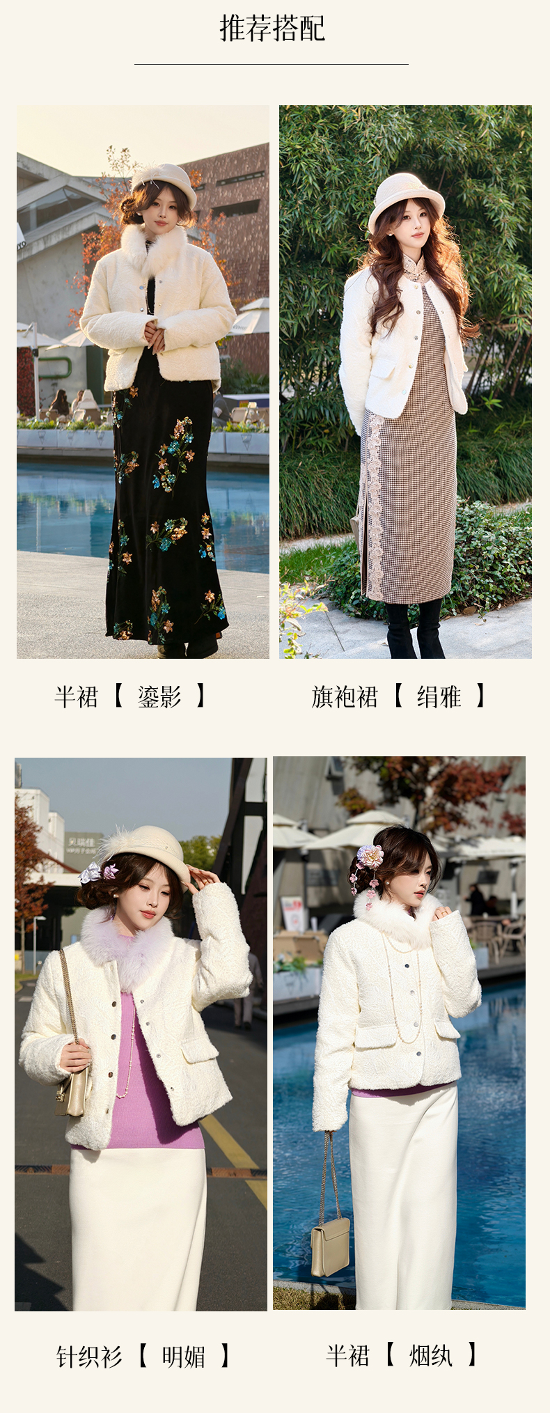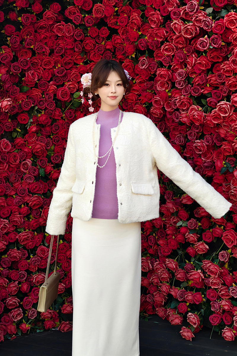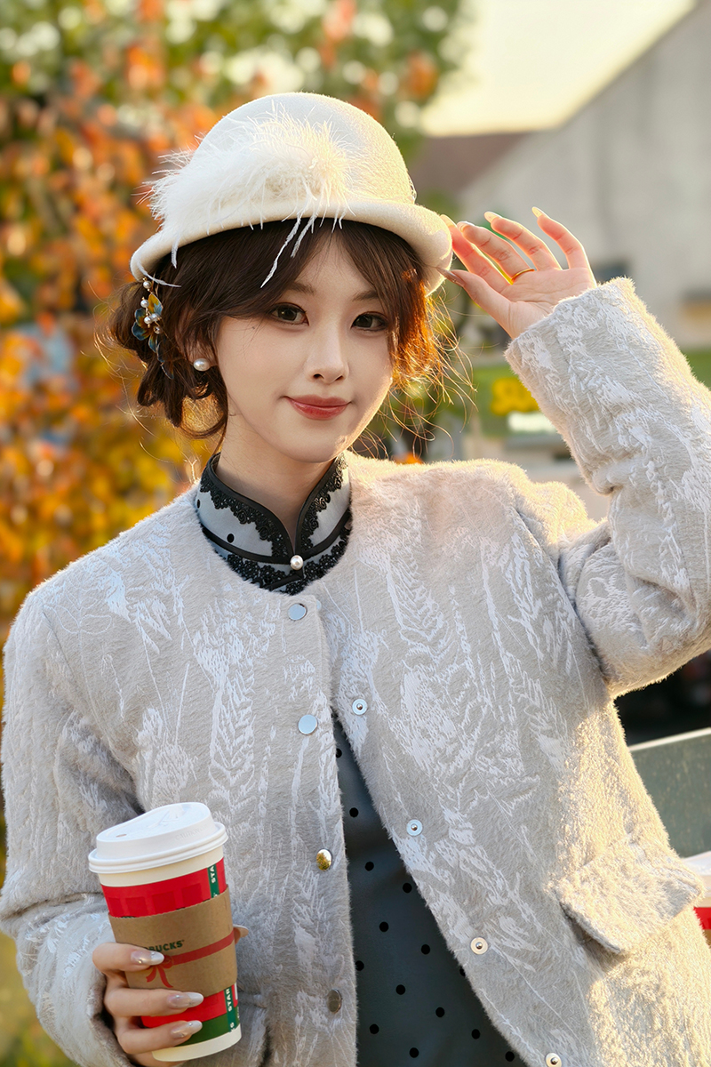 「花」,是自然之美在衣襟的绽放——通过毛感提花面料,复现“琅花偶白芝”的秀雅纹理,让姐妹们仿佛行走于诗意的花廊之间。