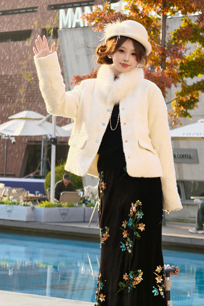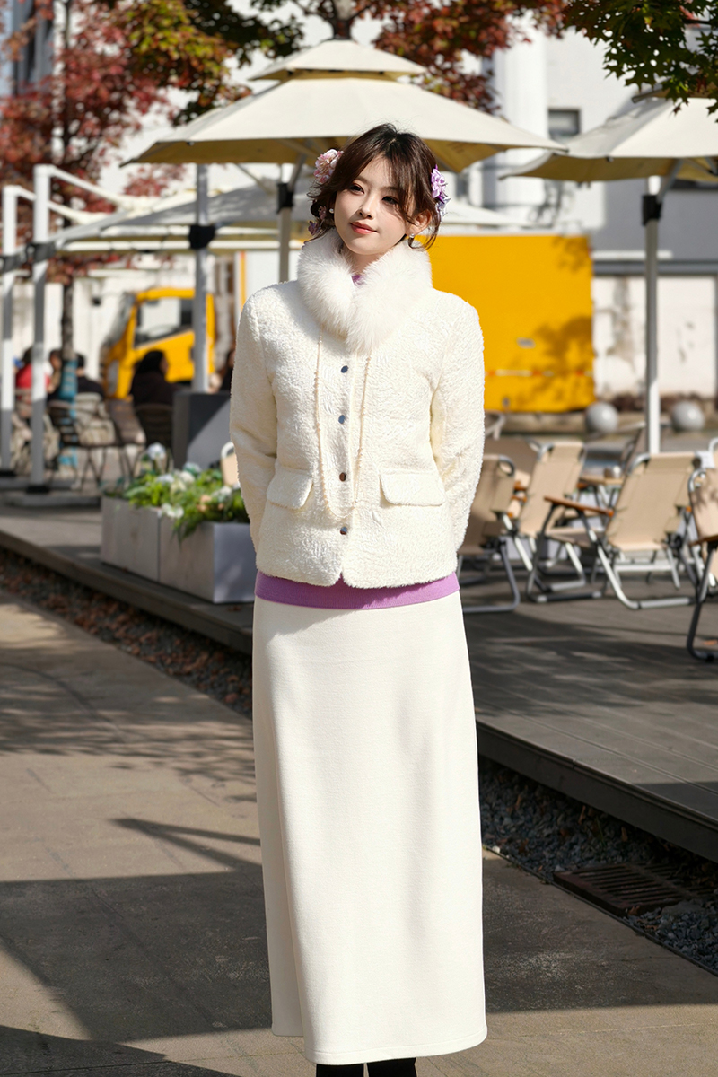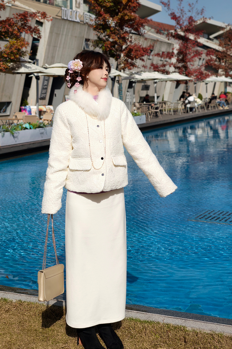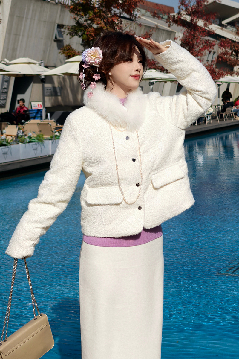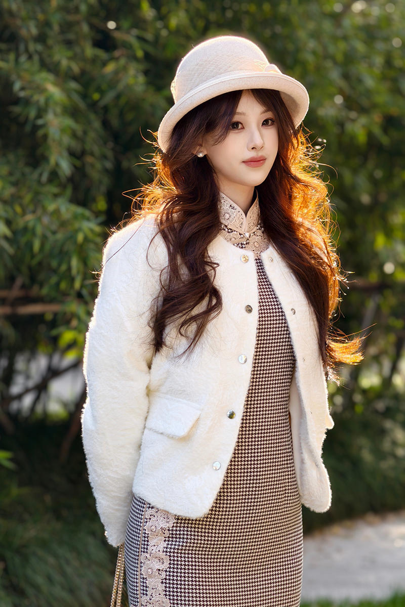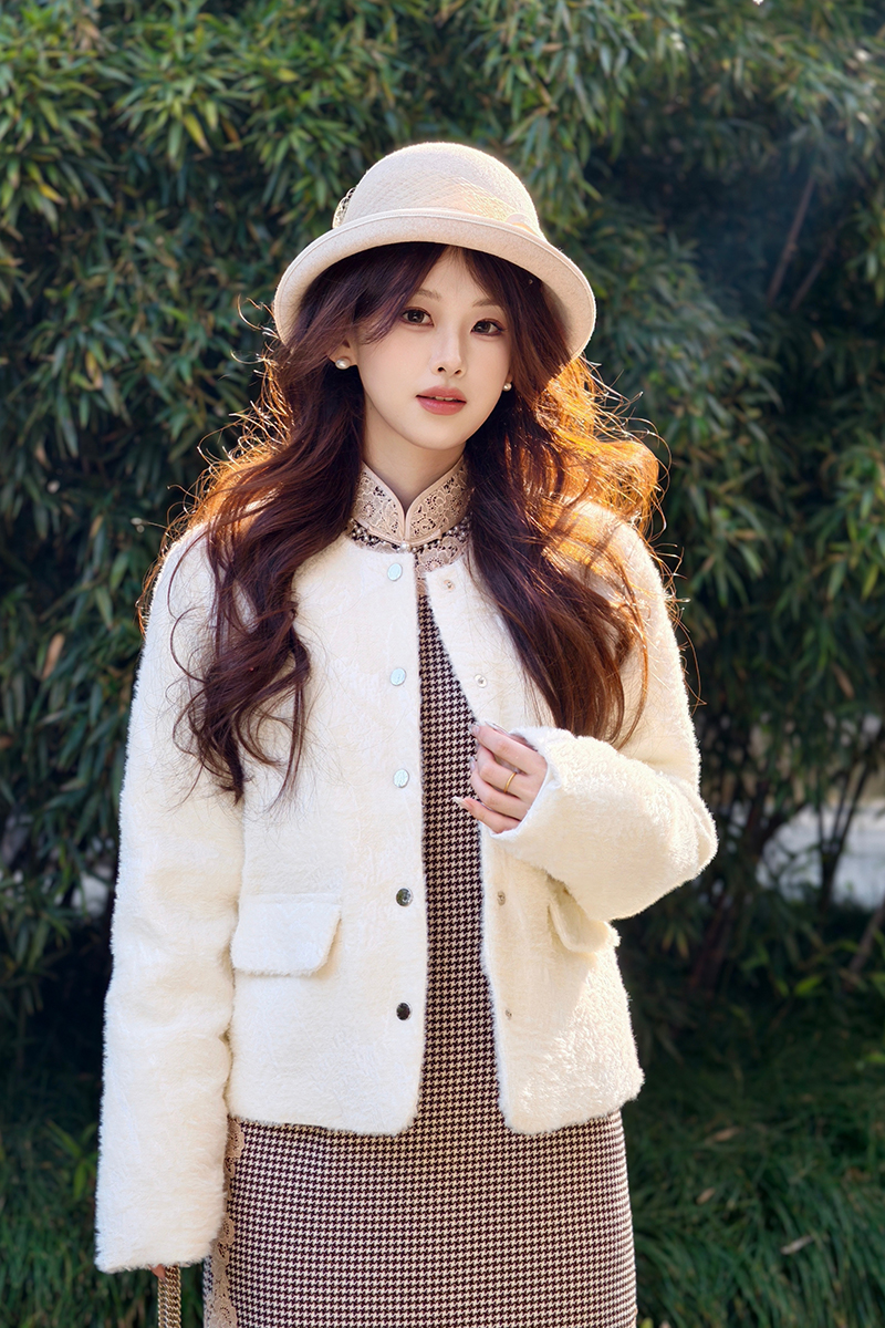 「花」,是自然之美在衣襟的绽放——通过毛感提花面料,复现“琅花偶白芝”的秀雅纹理,让姐妹们仿佛行走于诗意的花廊之间。