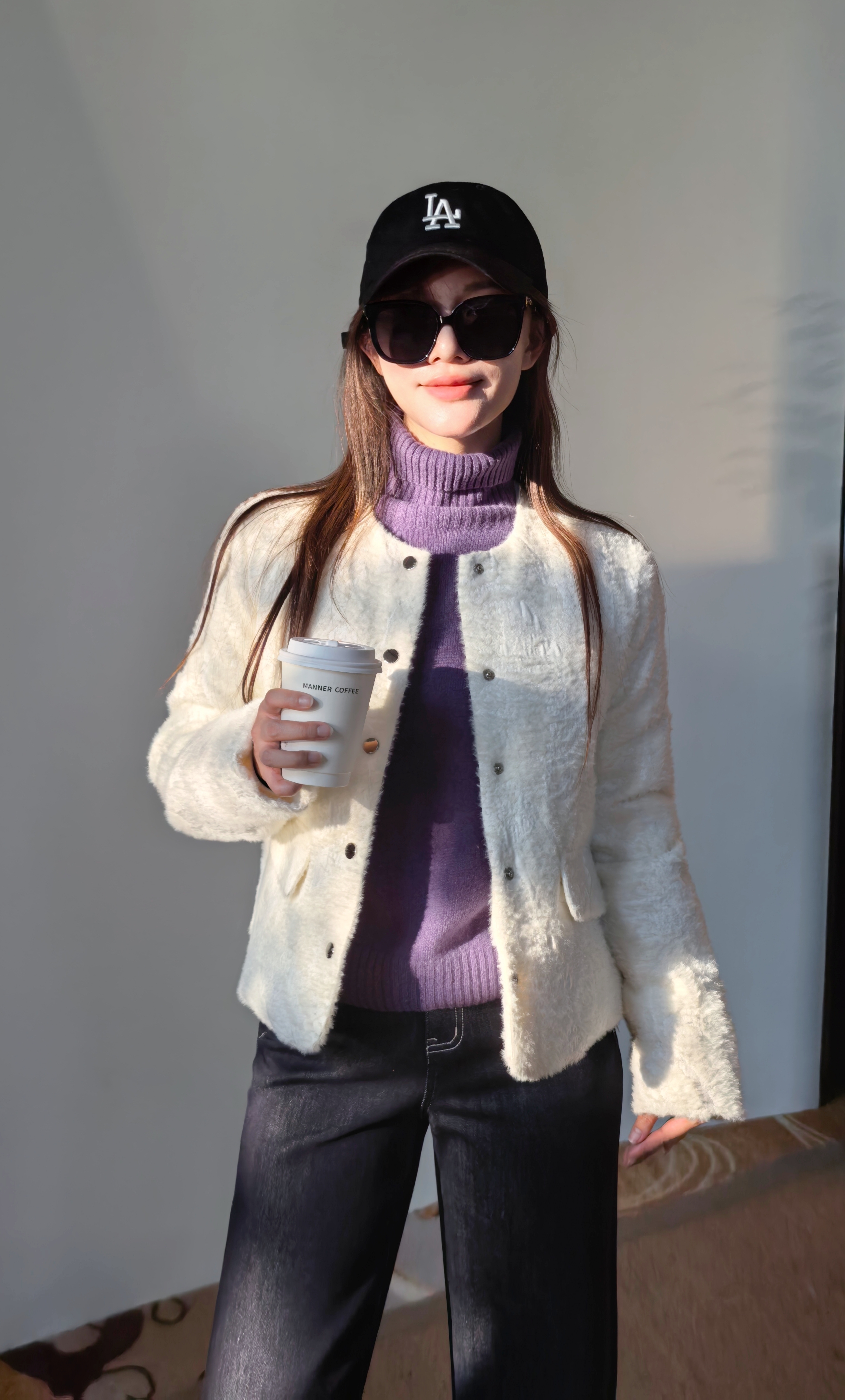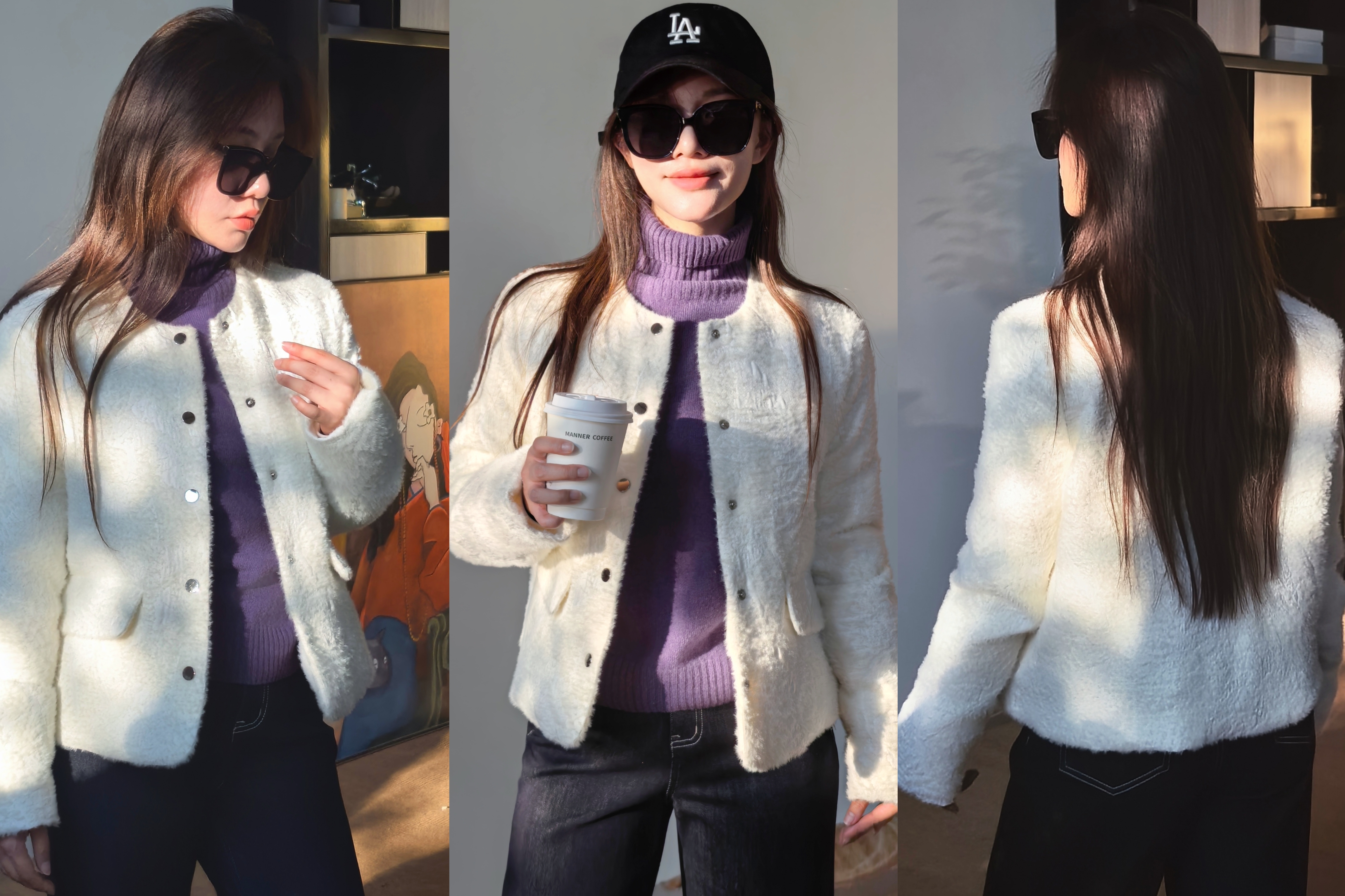 内搭紫毛衣撞色刚好戳中冬日氛围感