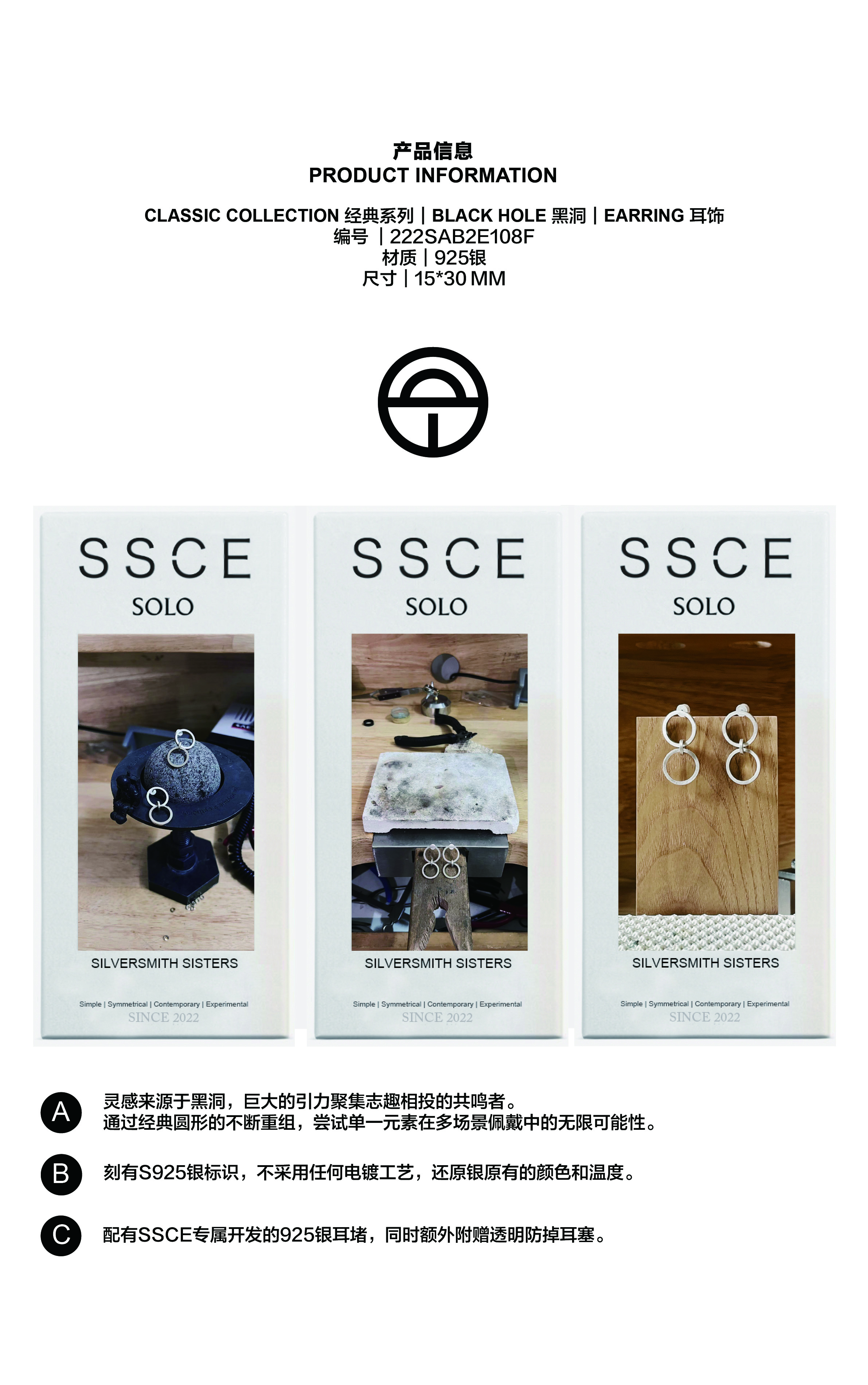 SSCE|222SAB2E108F Earrings黑洞耳环15x30mm【BLACK HOLE】