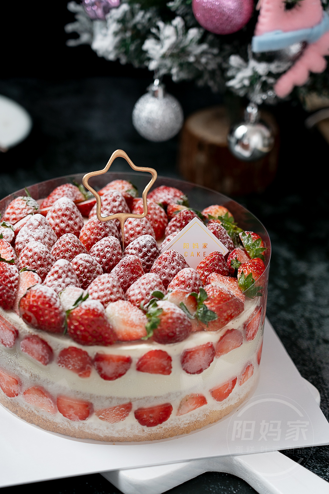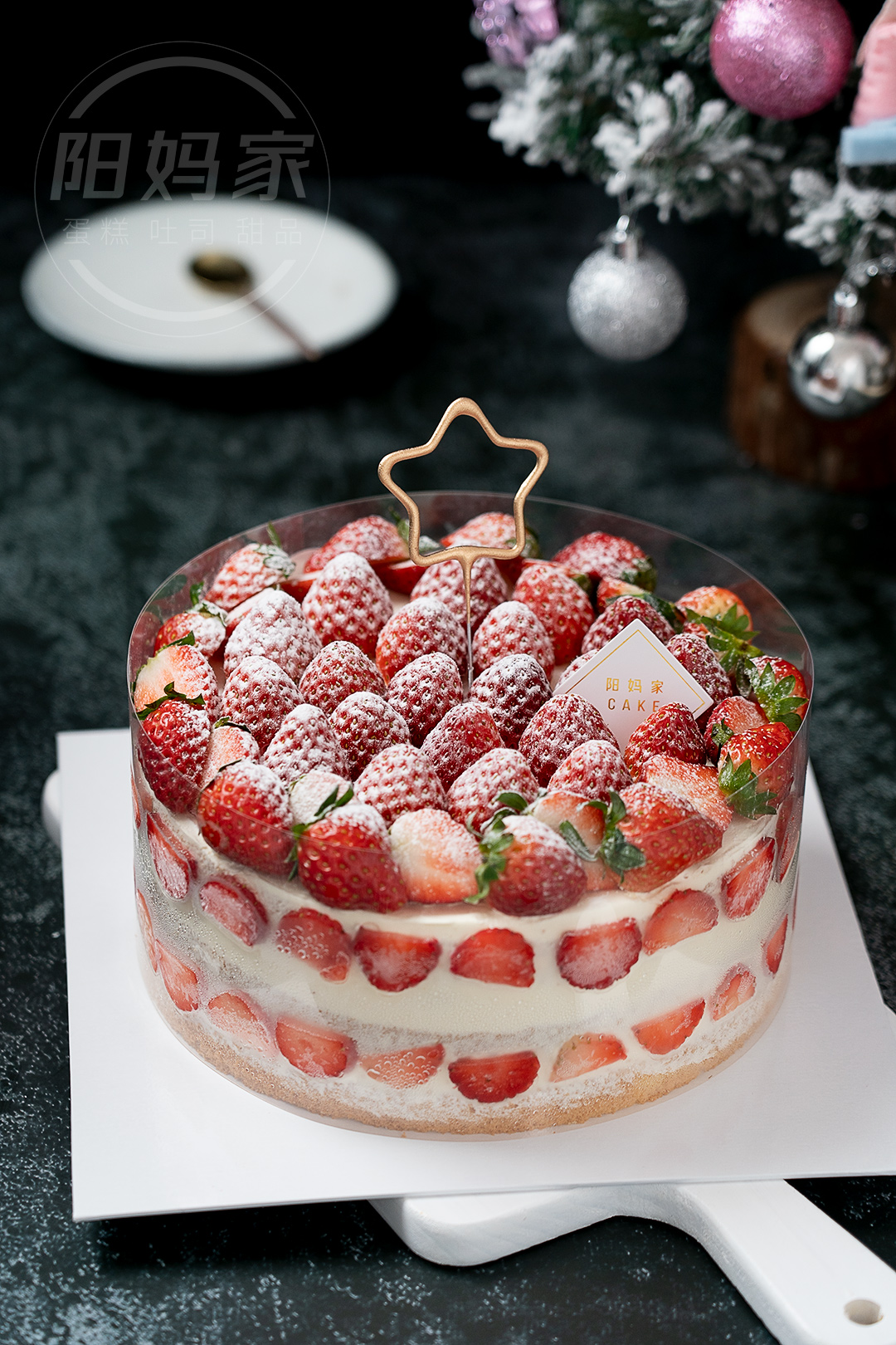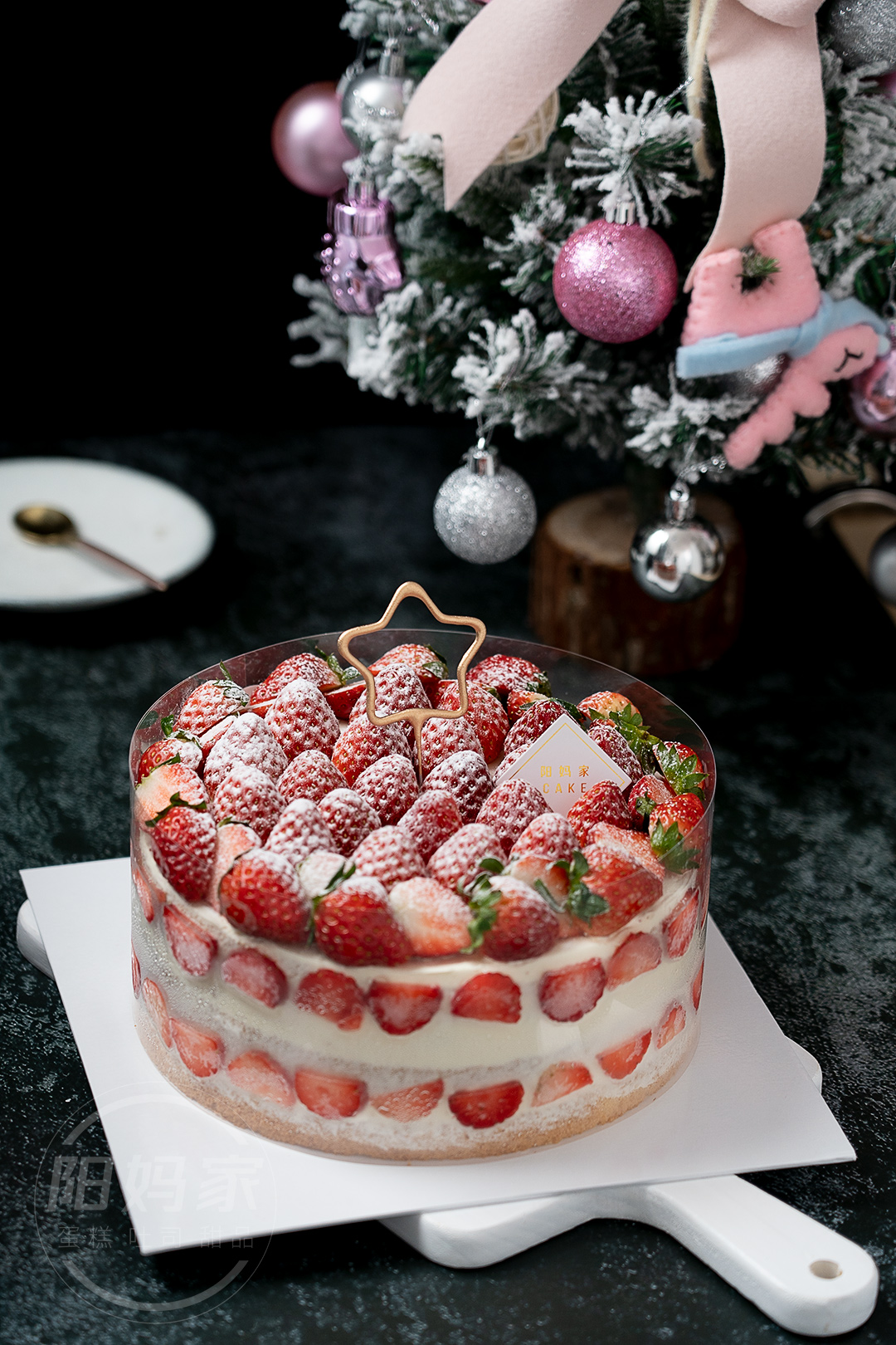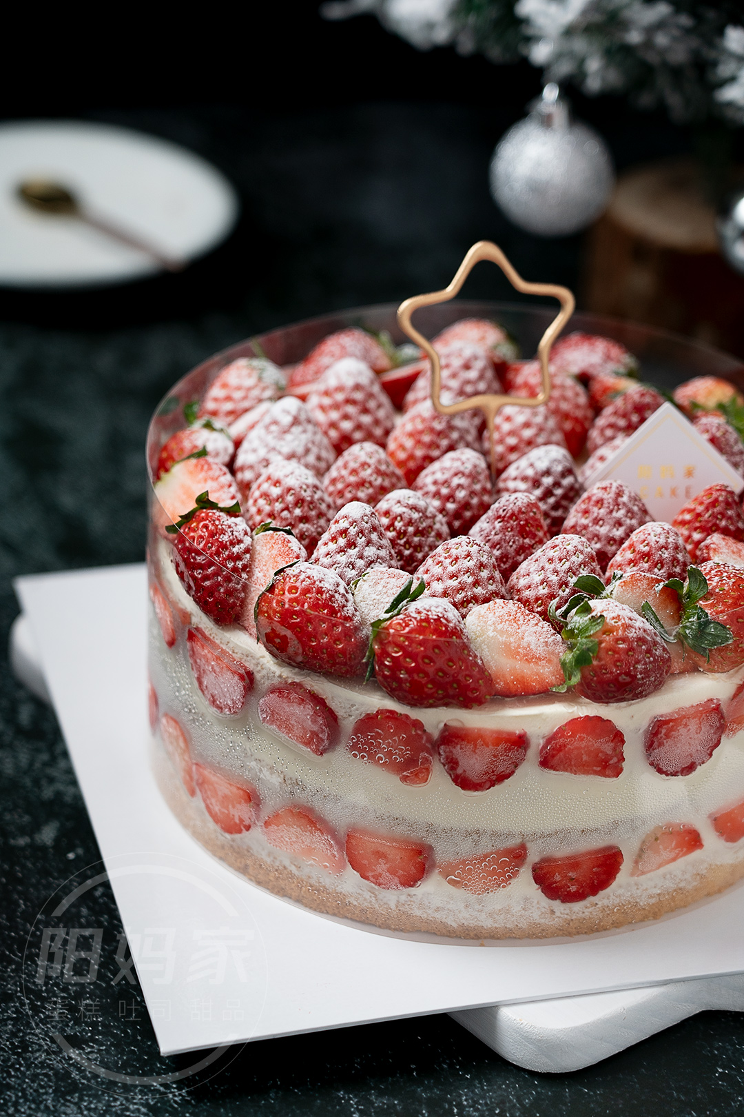 草莓微雪蛋糕近似裸蛋糕,采用三层胚夹两层水果奶油,整体奶油偏少,更突出草莓和戚风蛋糕的清爽口感。