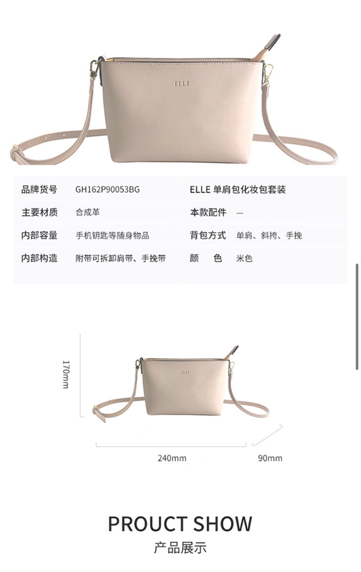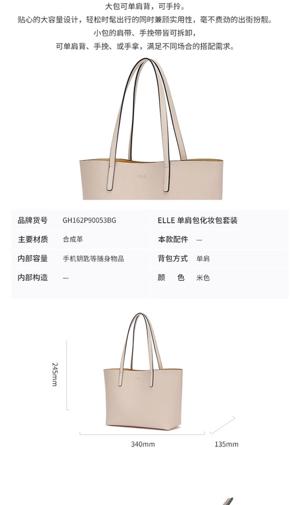 【品名】ELLE HOMME 单肩子母包/单肩斜跨包 通勤百搭 【规格】 米色-子母单肩包 黑色-斜挎包 【产地】国内 【发货包装】独立包装 【发货地】浙江 【发货快递】邮政 【不发货区域】新疆、西藏、港澳台 【发货时效】48-72小时,周末节假日顺延 |