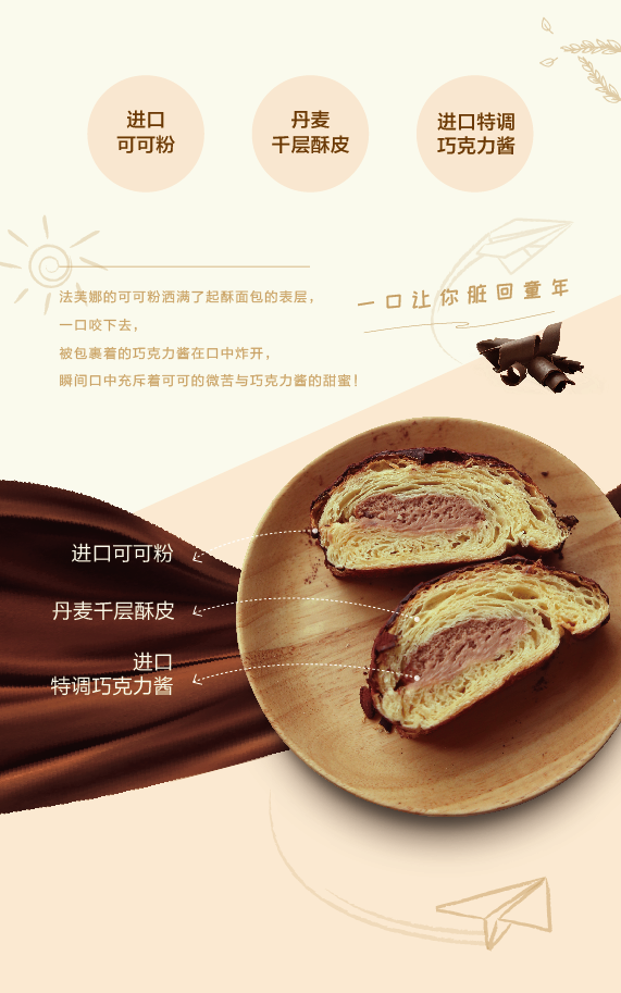 它是网红美食界的一股泥石流,其他的网红美食都是貌美如花从外表取胜,而它不仅“脏”吃起来还会弄得花了脸。但是就是因为它的“脏”的好吃啊!法芙娜的可可粉洒满了起酥面包的表层,一口咬下去,被包裹着的巧克力酱在口中炸开,瞬间口中充斥着可可的微苦与巧克力酱的甜蜜!