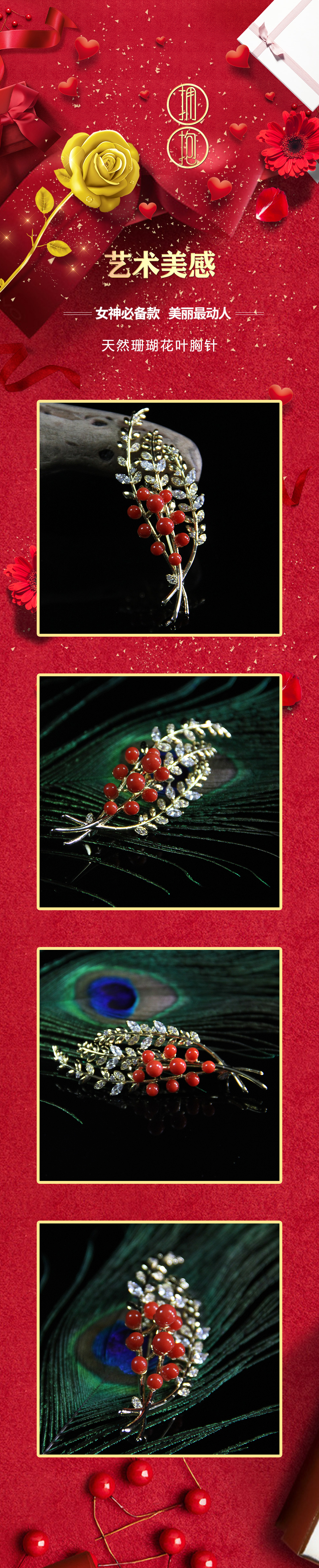 天然珊瑚花叶胸针