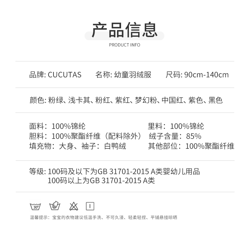Cucutas幼童羽绒服CY25WIW581中国红/黑色/粉色/紫色/粉绿/浅卡其(90#-140#)