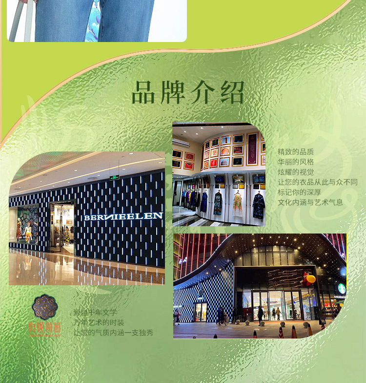 行业首家从事文创研发的女装品牌-伯妮斯茵 品牌风格:源自千年文学和万年艺术的时装,让你的气质内涵一枝独秀,精彩的品质,华丽的风格,炫耀的视觉,让你的衣品从此与众不同,标记你深厚的文化内涵与艺术气息。