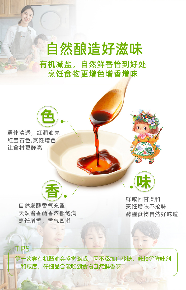 【注意事项】第一次尝试有机酱油会感觉略咸,因为不添加白砂糖、味精等鲜味剂中和碱度,仔细品尝能吃到食物自然鲜香味。