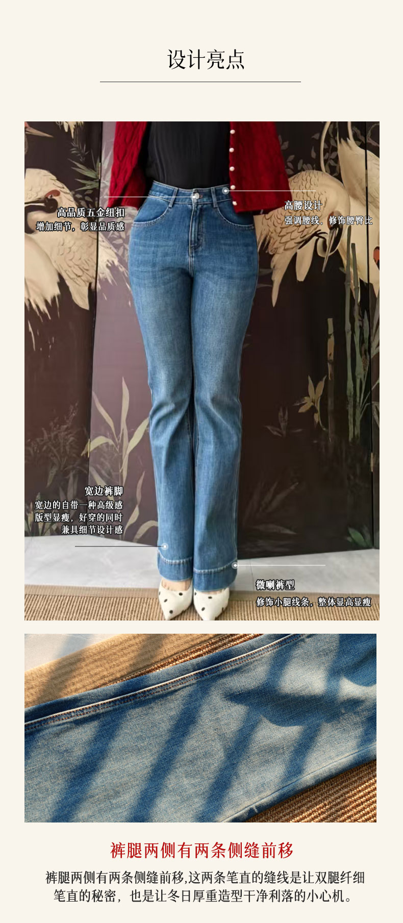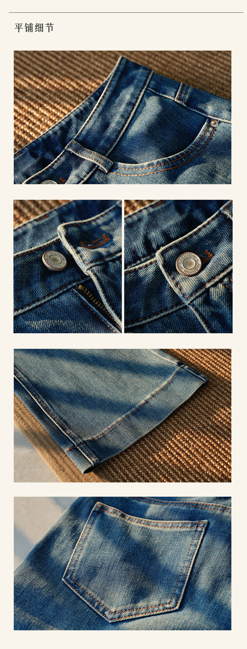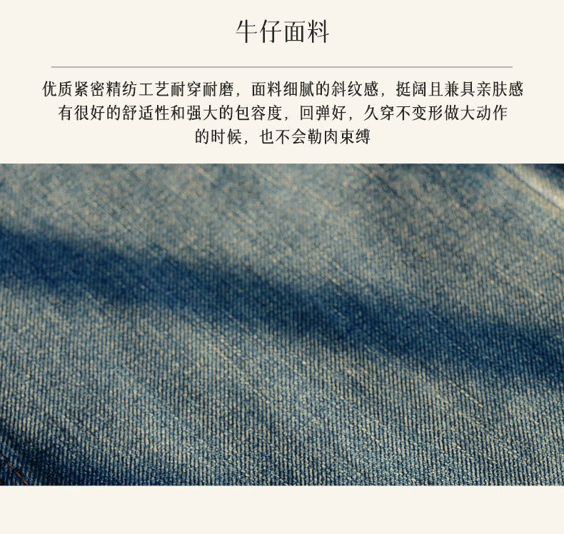 高腰的设计能提升腰线,纵向拉长腿部线条,从而打造三七完美比例,我们特意在裤子前幅做了猫须、马骝痕处理,既增加了复古真是的牛仔味道,也能几种视觉焦点,达到显瘦效果。