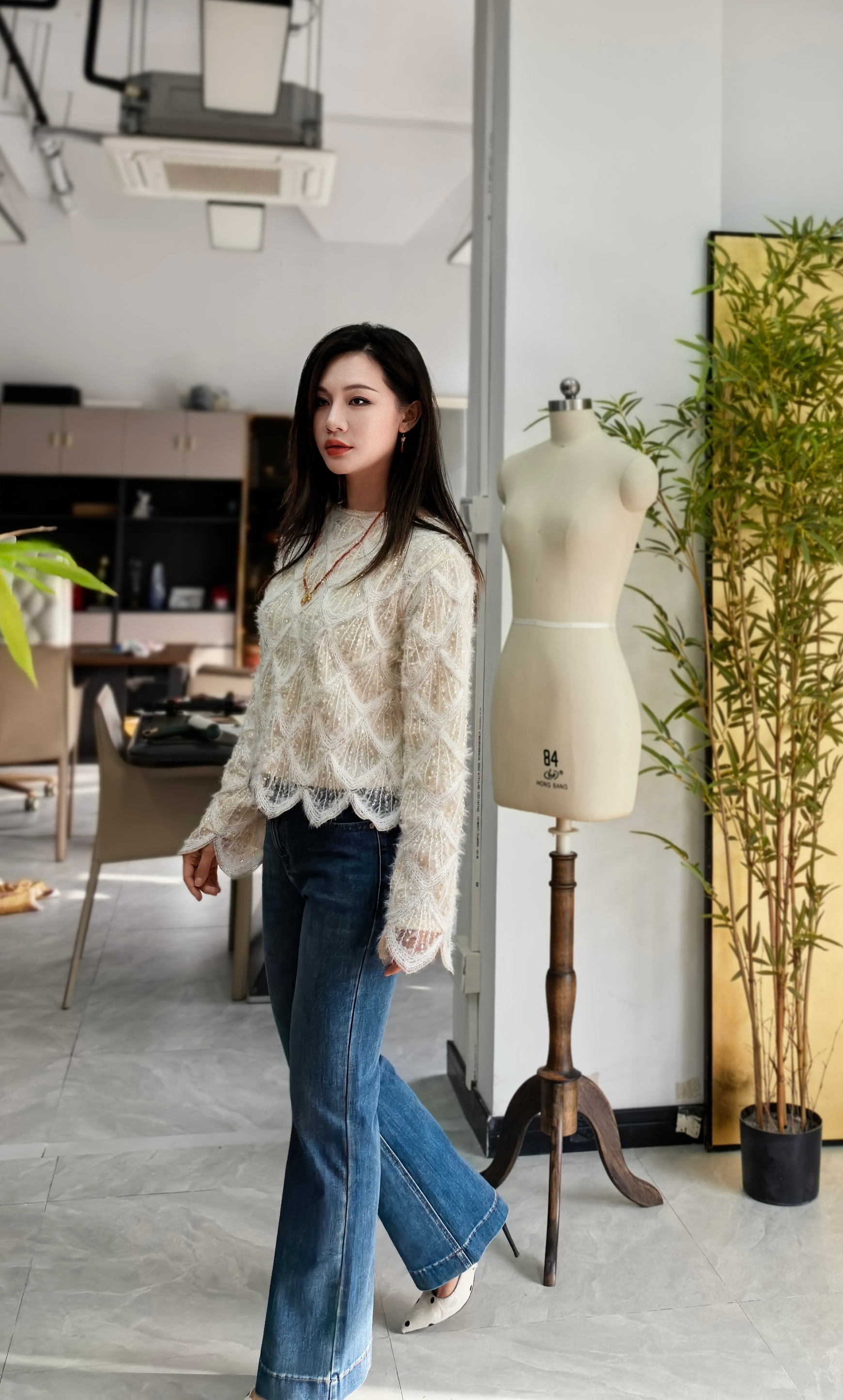 这条牛仔裤是微喇的版型,没有传统的喇叭裤那么挑人,最大的优点就是修饰小腿线条,把大小腿的比例做矫正,显得腿部上下一样的笔直纤细。