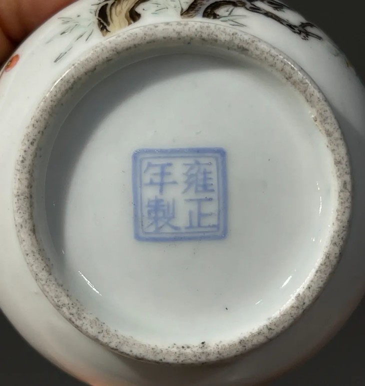 此瓷胎珐琅彩梅花纹水盂,制作严谨细致,官家气质十足,雍正款識端正典雅,与雍正本朝之珐琅彩瓷器风格相近,应是清末民初古玩商人依宫廷旧制所订制之高端仿品,当时是欧美东瀛古玩收藏界视为雍正本朝料胎绘珐琅之精品。如图所示,此瓷胎珐琅彩梅花纹水盂,除釉面有使用痕迹与细微磨损外,基本保存完好。