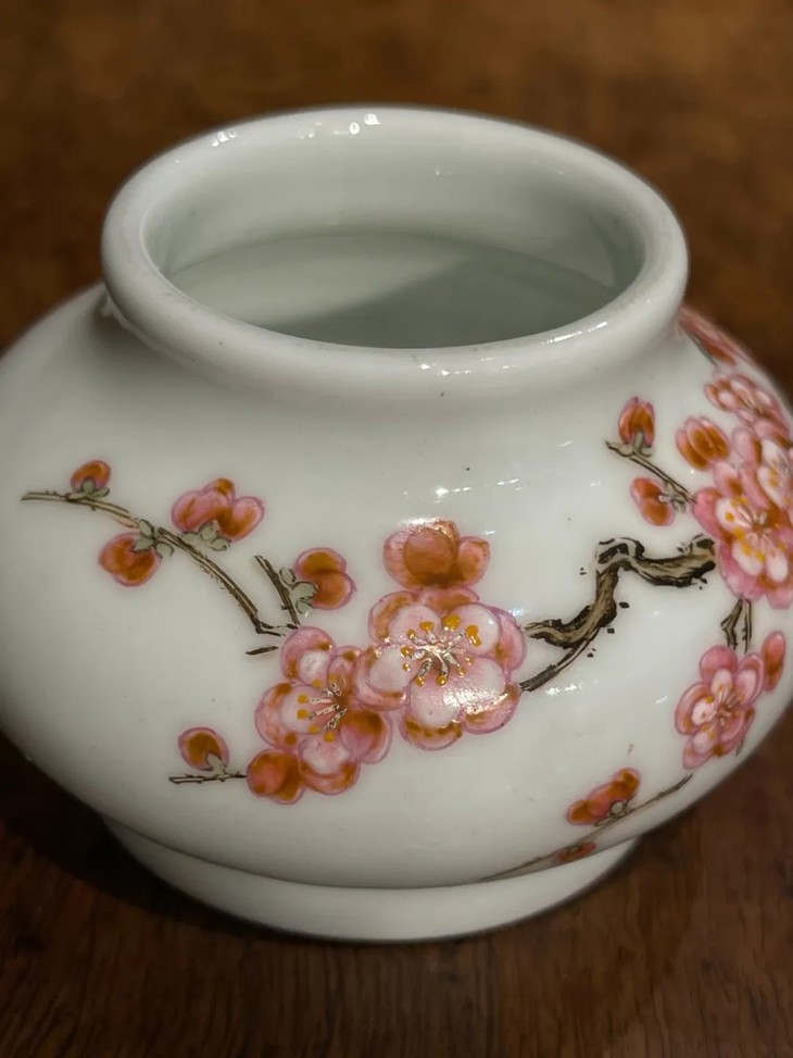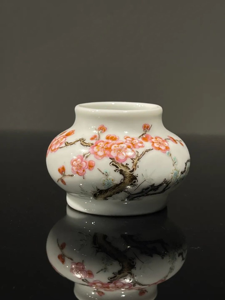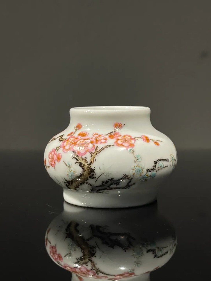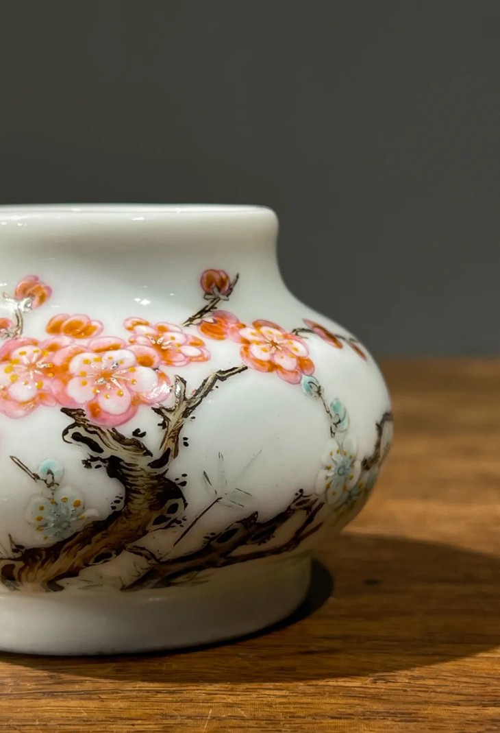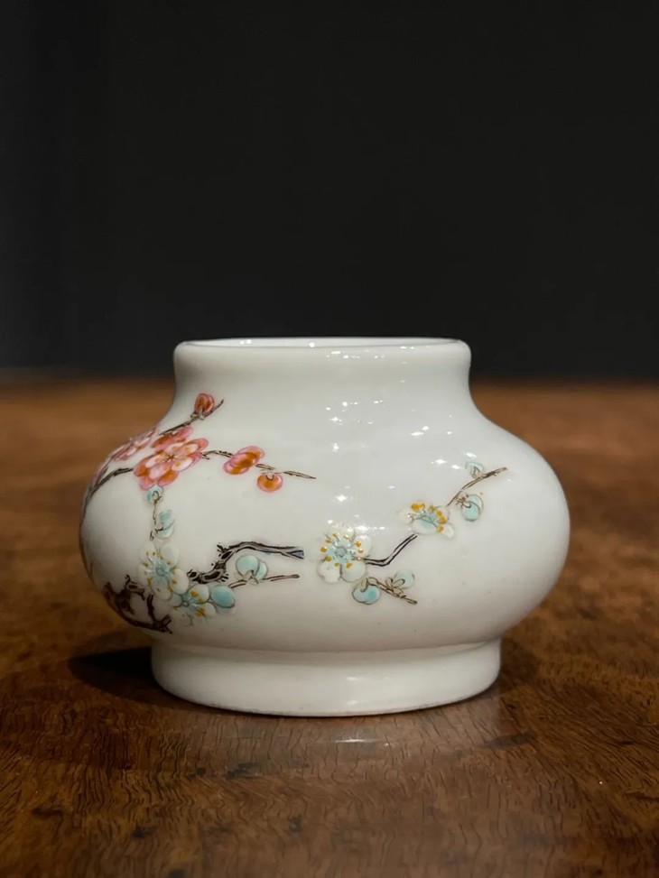 这是一件制作精美的瓷胎珐琅彩梅花纹水盂,白瓷扁腹短颈型小罐,环绕器身以珐琅彩料绘红白梅花枝,典型堆砌凸起珐琅料,绘画风格颇有清代宫廷绘师之风,依循清代宫廷內务府造办处珐琅作坊所谓“古月轩“的瓷胎绘珐琅技艺。