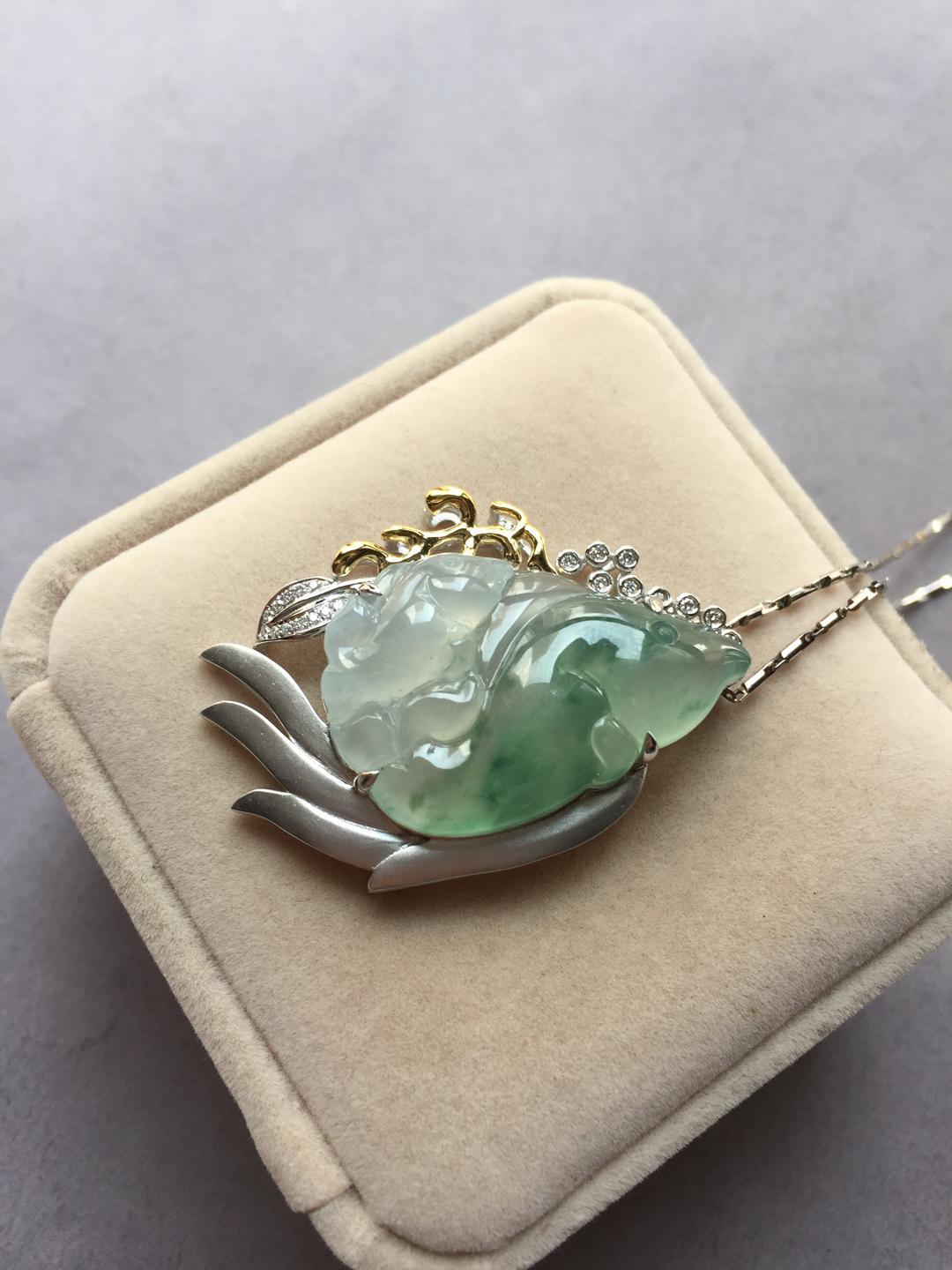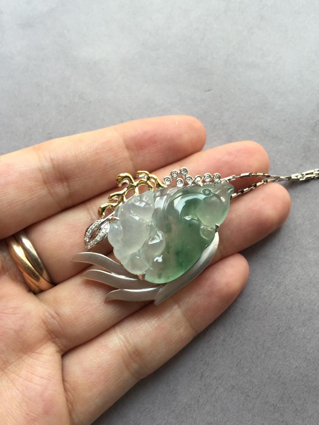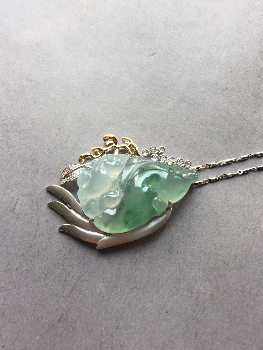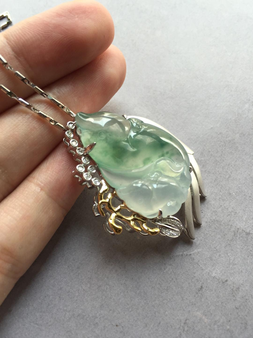 翡翠高冰种飘花母子豚,浪漫海洋主题,33.9*22.8*5.6mm,镶嵌后44.6*31.5*10.3mm。种水棒的大宝贝,荧光四射,丝绸般爽滑的质感,飘花巧雕海豚妈妈,身后是可爱的海豚宝宝,18k白金镶嵌海草,18k黄金钻石镶嵌珊瑚,白金钻石鱼儿吐泡泡,太特别了