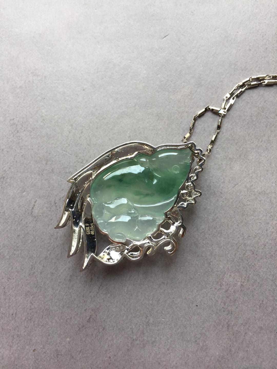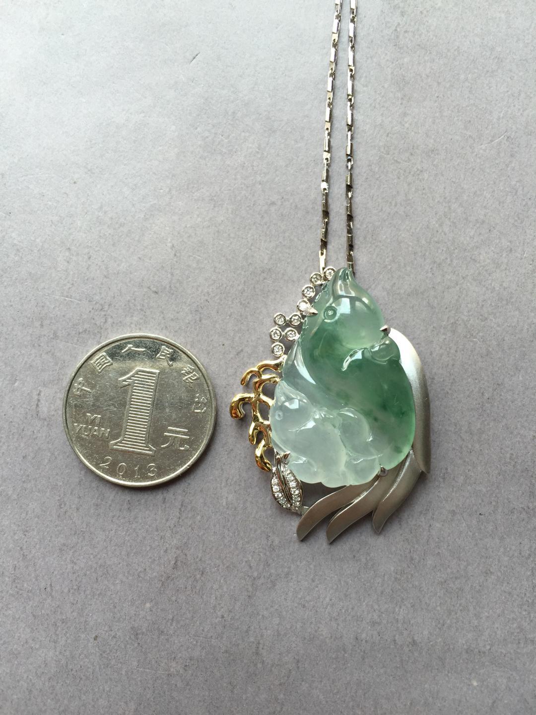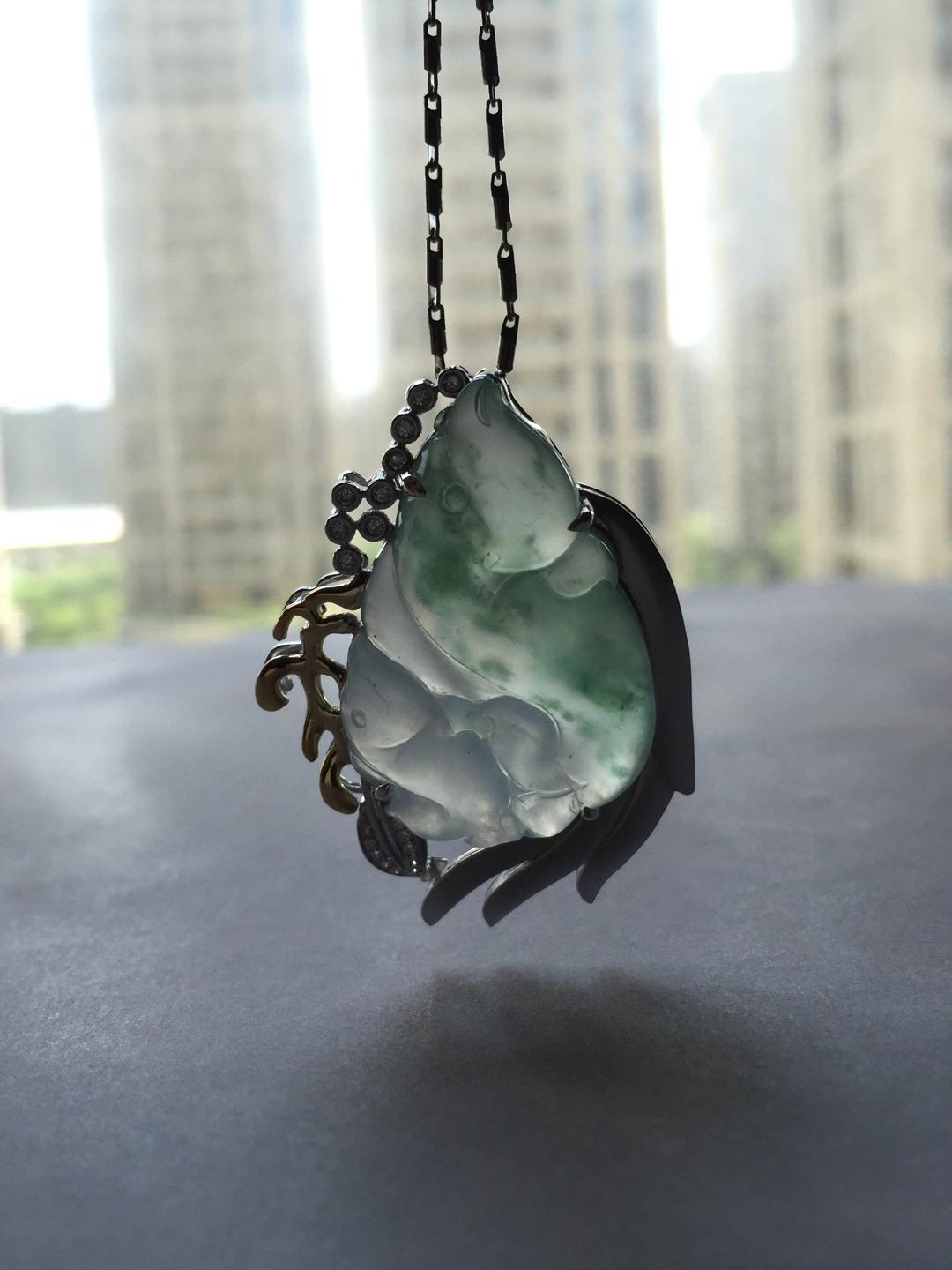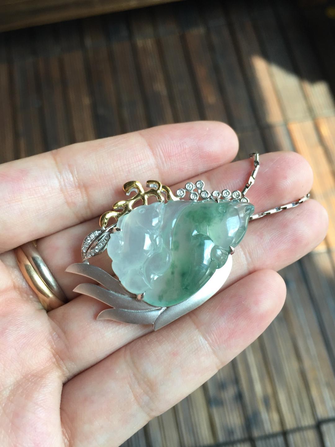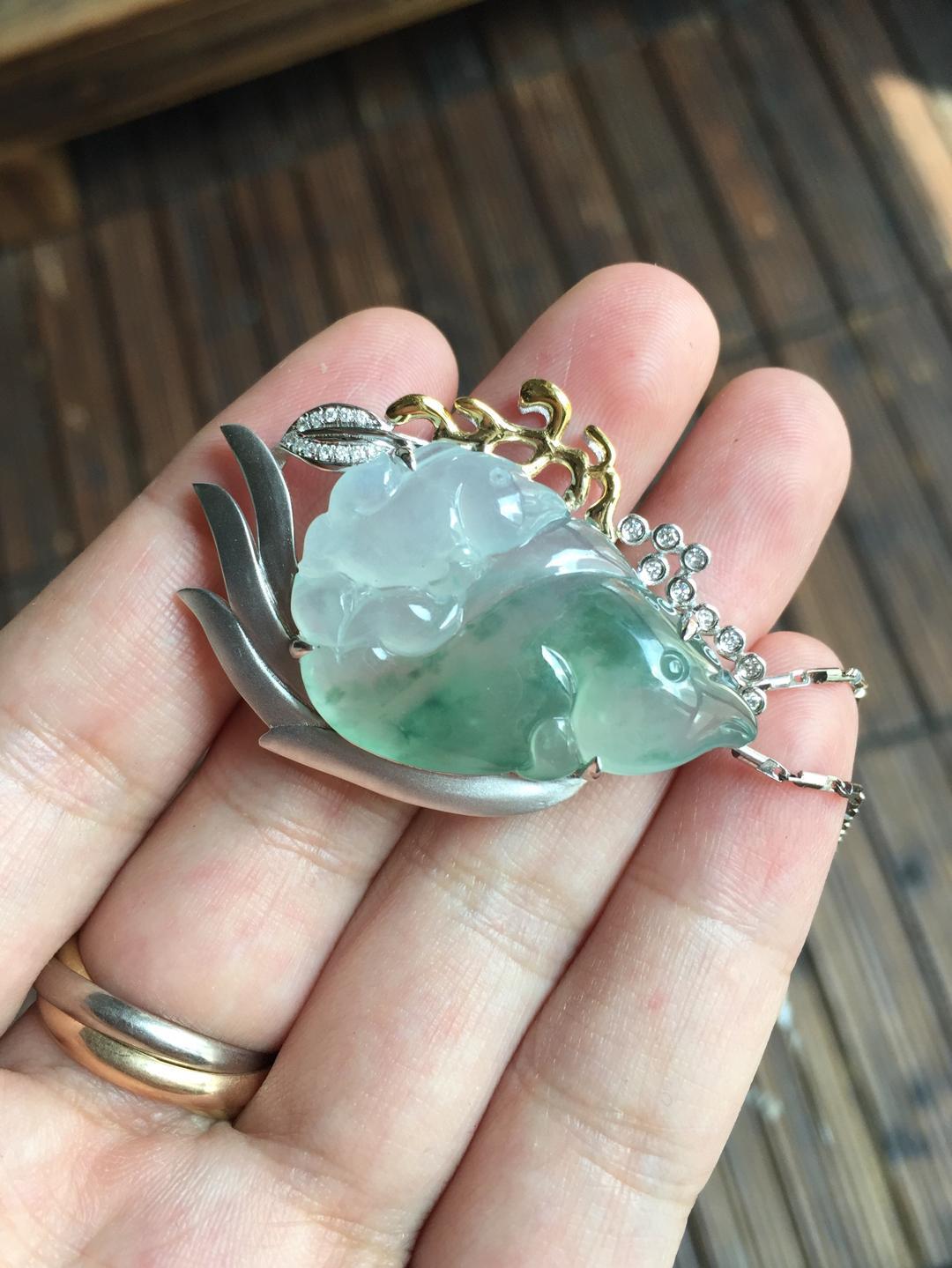 翡翠高冰种飘花母子豚,浪漫海洋主题,33.9*22.8*5.6mm,镶嵌后44.6*31.5*10.3mm。种水棒的大宝贝,荧光四射,丝绸般爽滑的质感,飘花巧雕海豚妈妈,身后是可爱的海豚宝宝,18k白金镶嵌海草,18k黄金钻石镶嵌珊瑚,白金钻石鱼儿吐泡泡,太特别了