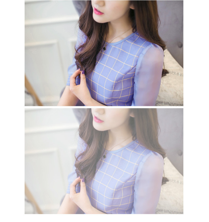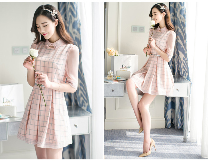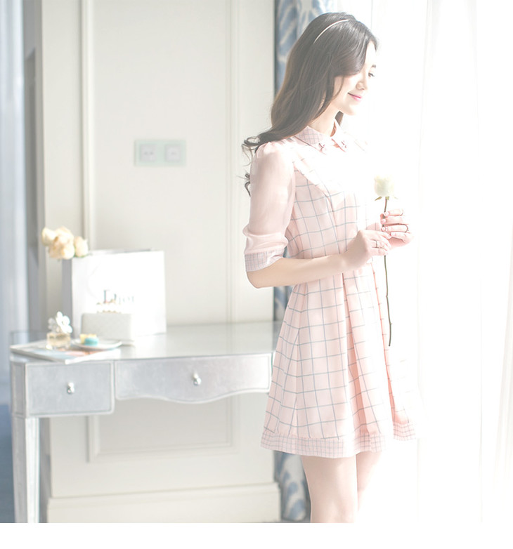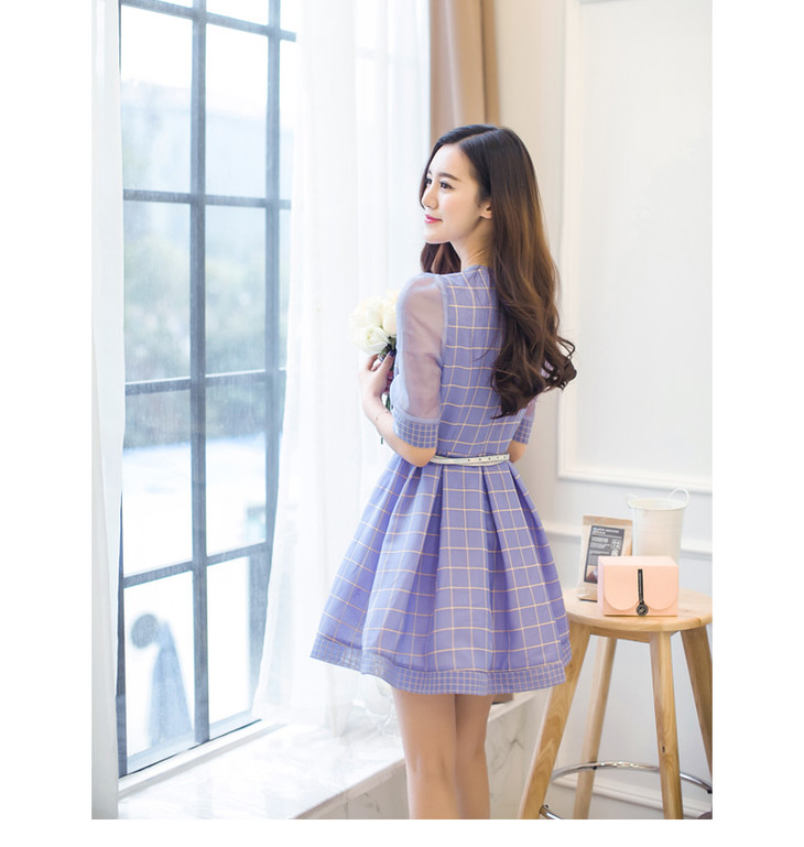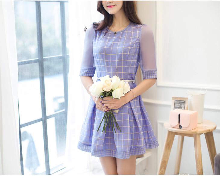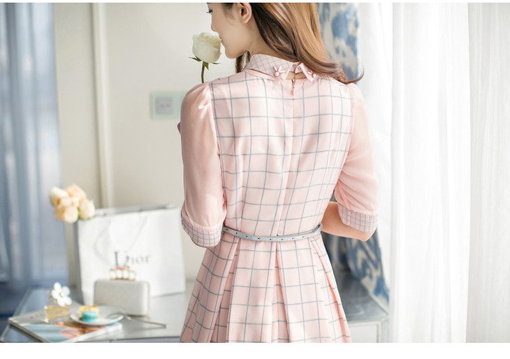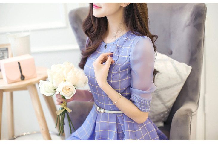 【服饰鞋包】夏装新款女装雪纺连衣裙韩版淑女中袖格子打底裙夏