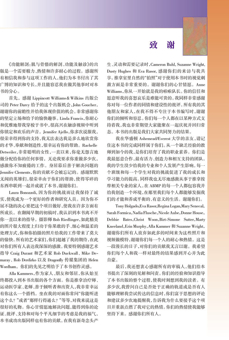 本书通过大量图片和肌运动练习,帮助读者探索和理解人体的结构、局部解剖和运动特点。书中涵盖大量彩色照片和手绘插图,能为读者清晰勾画出身体的每一层结构,从骨到韧带、从浅层肌到深层肌都得到清晰表现。本书肌肉解剖图表明了肌的起点、止点和神经支配,同时采用循序渐进的指导帮助读者学习骨与肌的触诊。