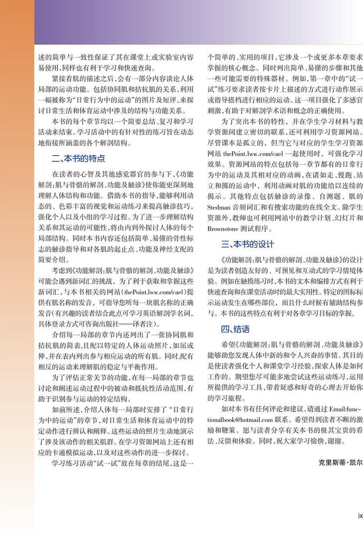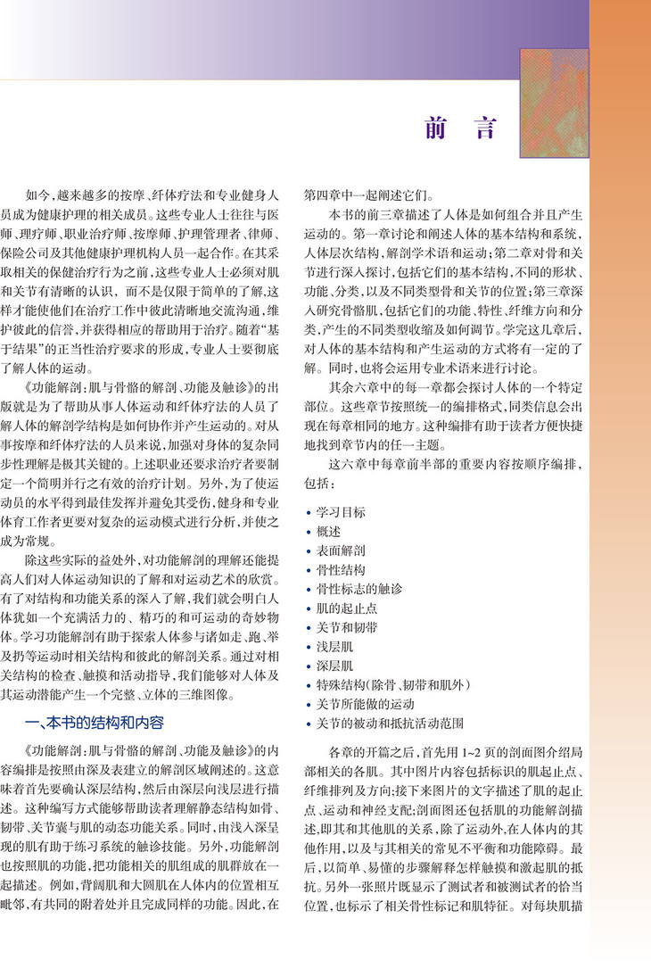 通过本书,读者可深入理解人体的结构,从而掌握这些结构如何通过关节运动来完成各种动作,并了解被动和抵抗活动范围的技巧。每章结尾综述了一些日常活动和体育运动类型所涉及的人体结构和功能。
