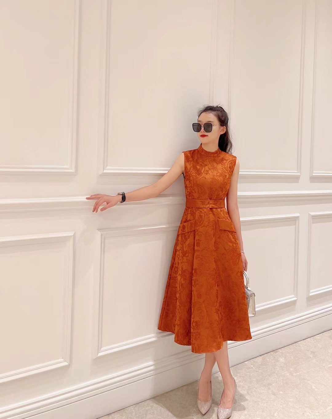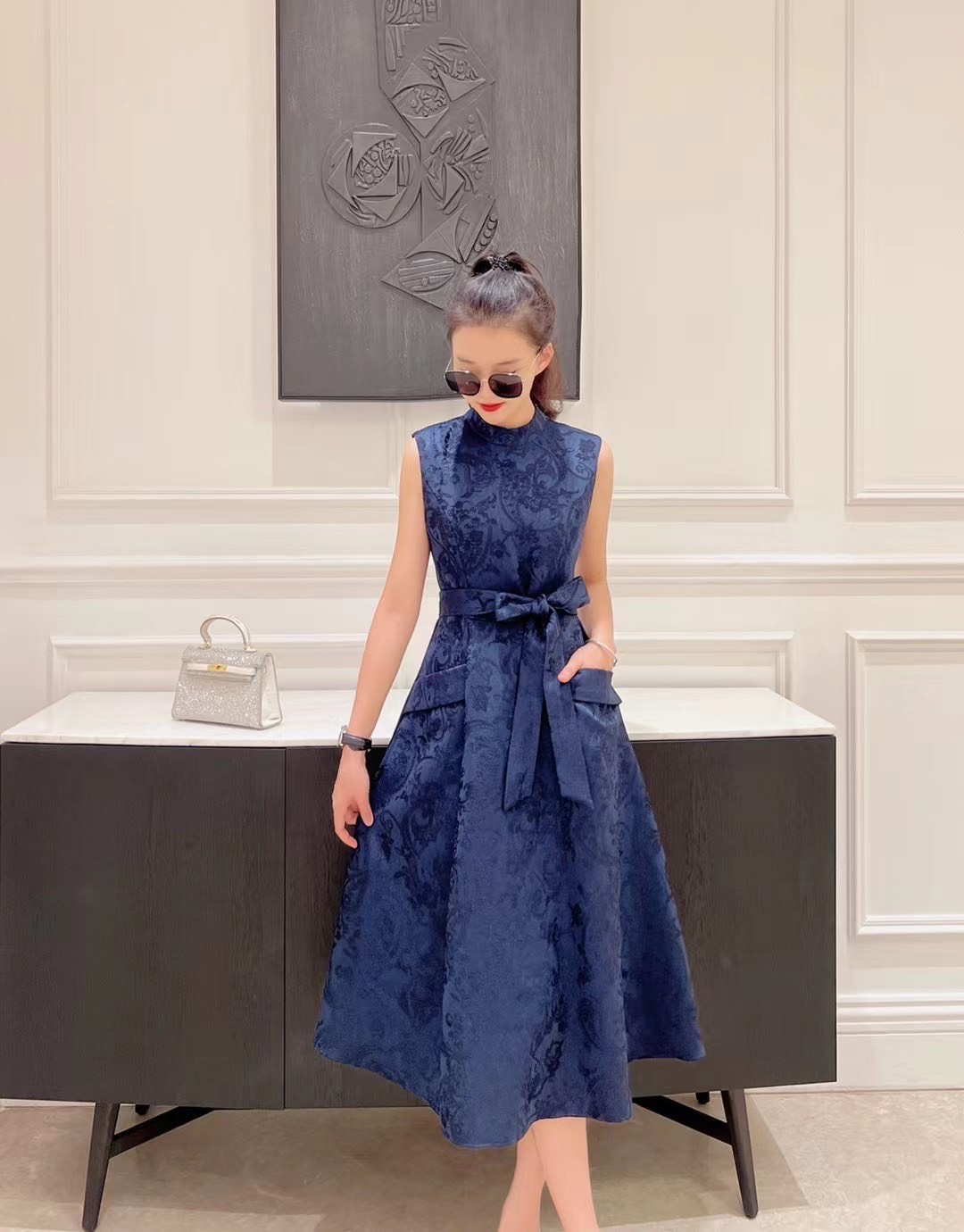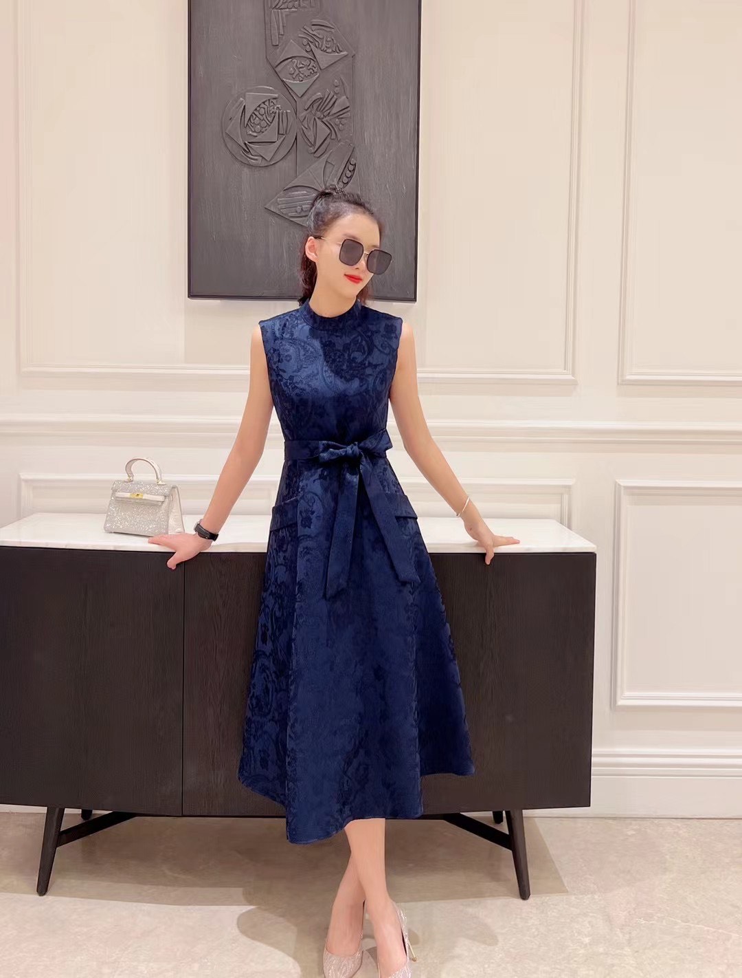 铅白、橘红、黛蓝色高级提花轻礼服连衣裙LZ3S68
