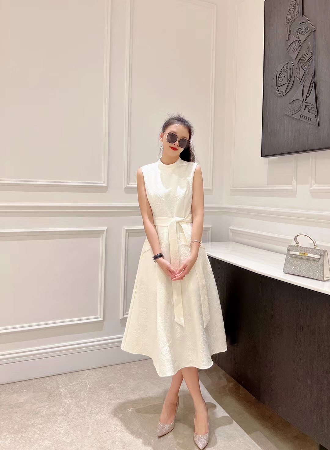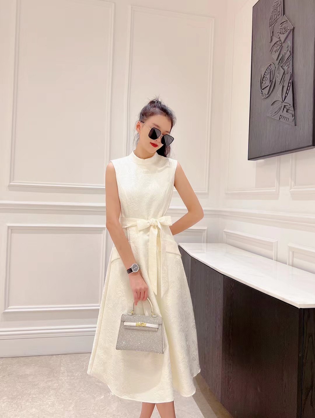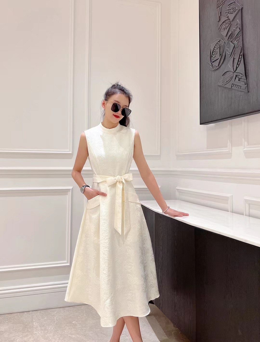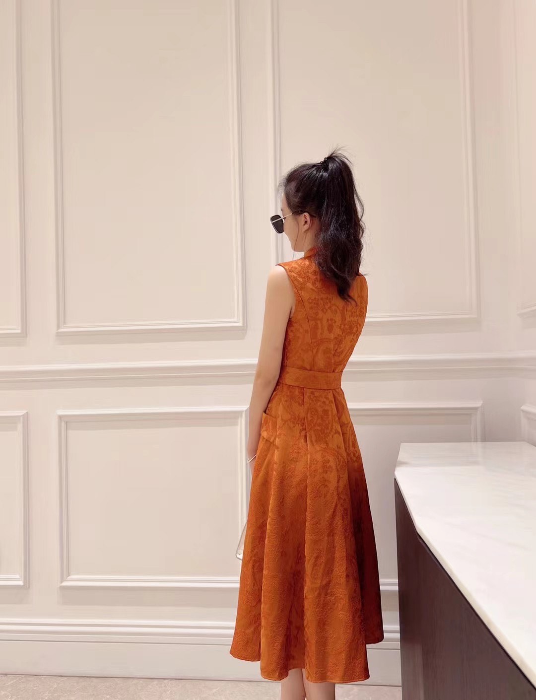 铅白、橘红、黛蓝色高级提花轻礼服连衣裙LZ3S68
