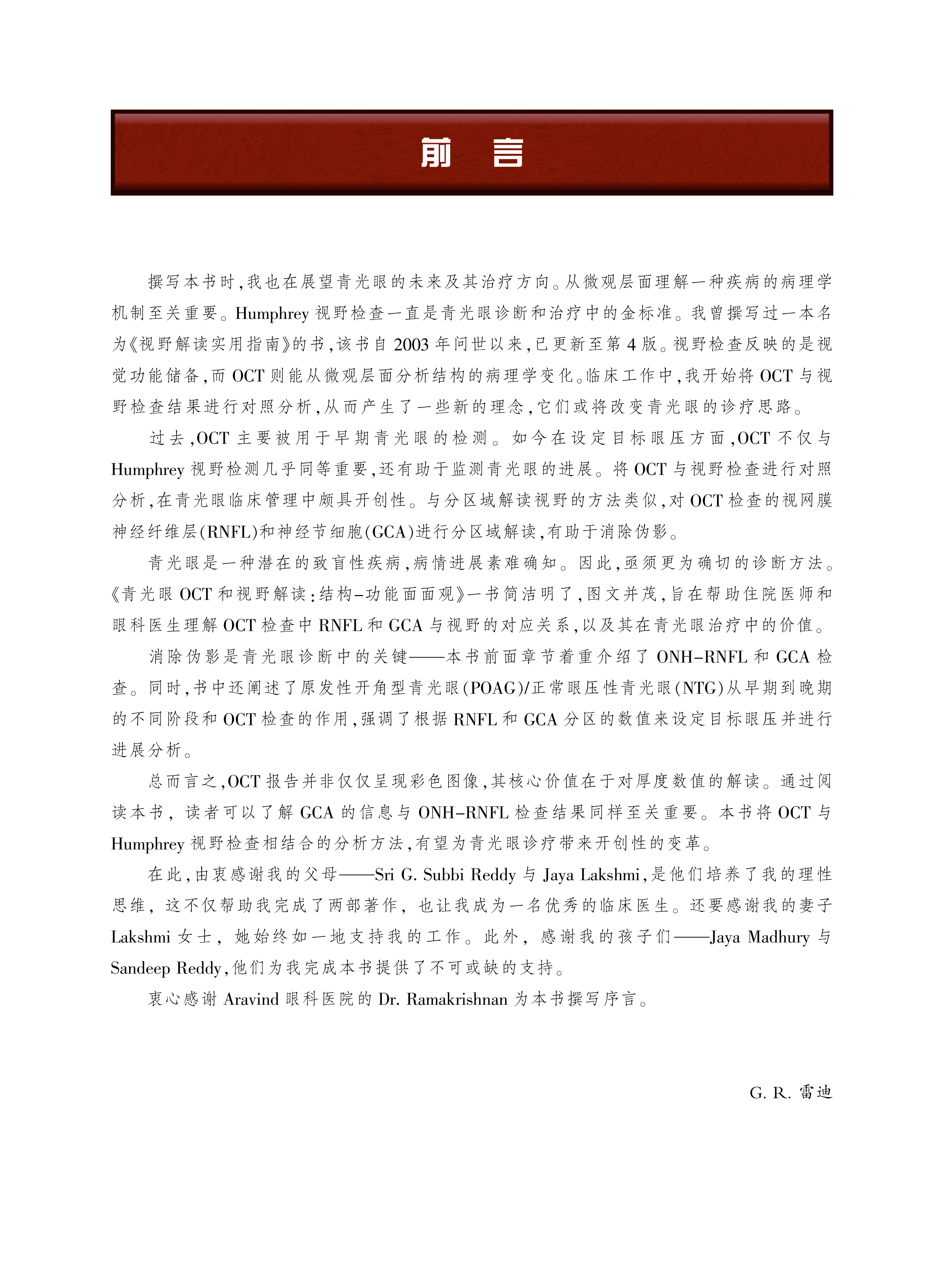 l 实用性:本书着重介绍了 ONH-RNFL 和 GCA 检查,同时还阐述了原发性开角型青光眼(POAG)/正常眼压性青光眼(NTG)从早期到晚期的不同阶段和OCT检查的作用,强调了根据 RNFL 和GCA分区的数值来设定目标眼压并进行进展分析,对临床工作具有一定的指导作用。