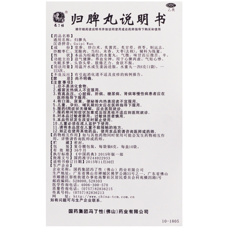 冯了性 归脾丸6g*10袋/盒益气健脾养血安神 气短心悸失眠多梦药品