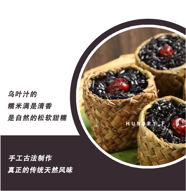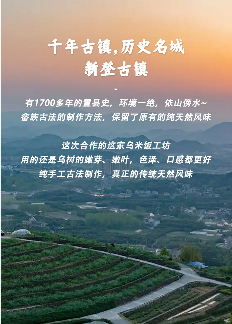 这次的乌米饭,来自拥有1700多年置县史的新登古镇。这里环境优美,依山傍水,完好地保留了畲族人民传统的乌米饭制作工艺。在选材上,当地上好的圆短糯米是不可或缺的主角,其洁白光润、口感绝佳,是制作乌米饭的绝佳之选。而乌米饭的灵魂,则在于那独特的乌树叶汁。工人们会亲自上山采摘乌树的嫩芽、嫩叶,经过精心筛选和清洗后,采用传统方法捶打出汁液。糯米在乌树叶汁中充分吸收清香,再用传统的柴火土灶蒸煮,出锅后乌黑亮泽,香气四溢。最后,用编小篓盛装,点缀一颗红枣,既美观又别致的送到我们面前!
