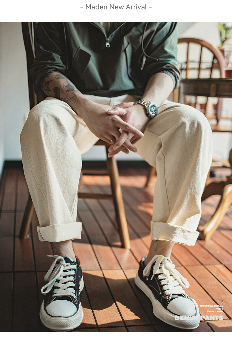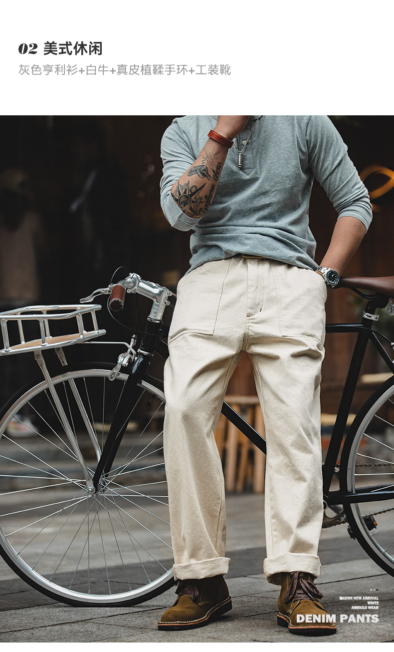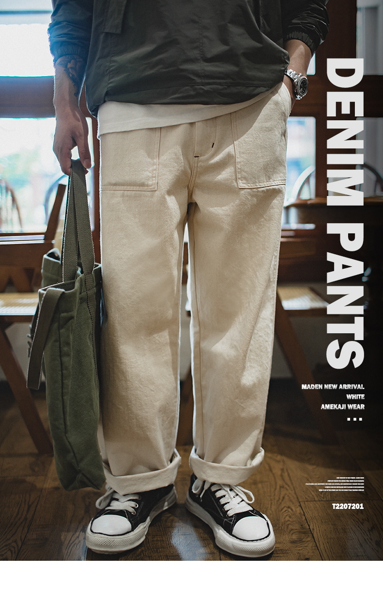 工装优选 日系复古棉籽壳米白色休闲牛仔裤耐磨宽松直筒长裤子男秋