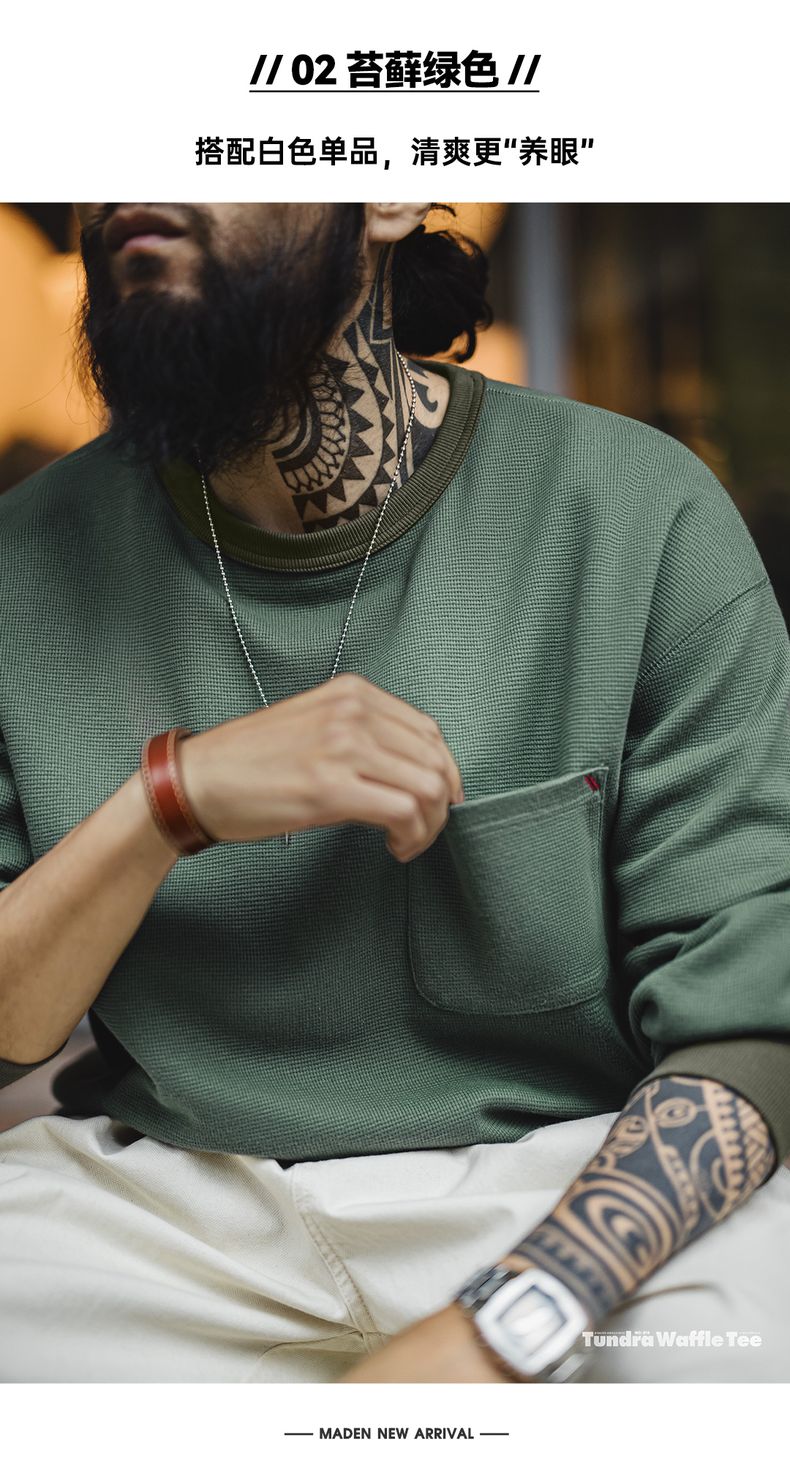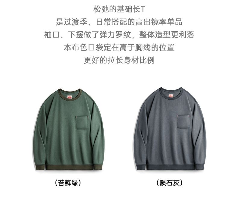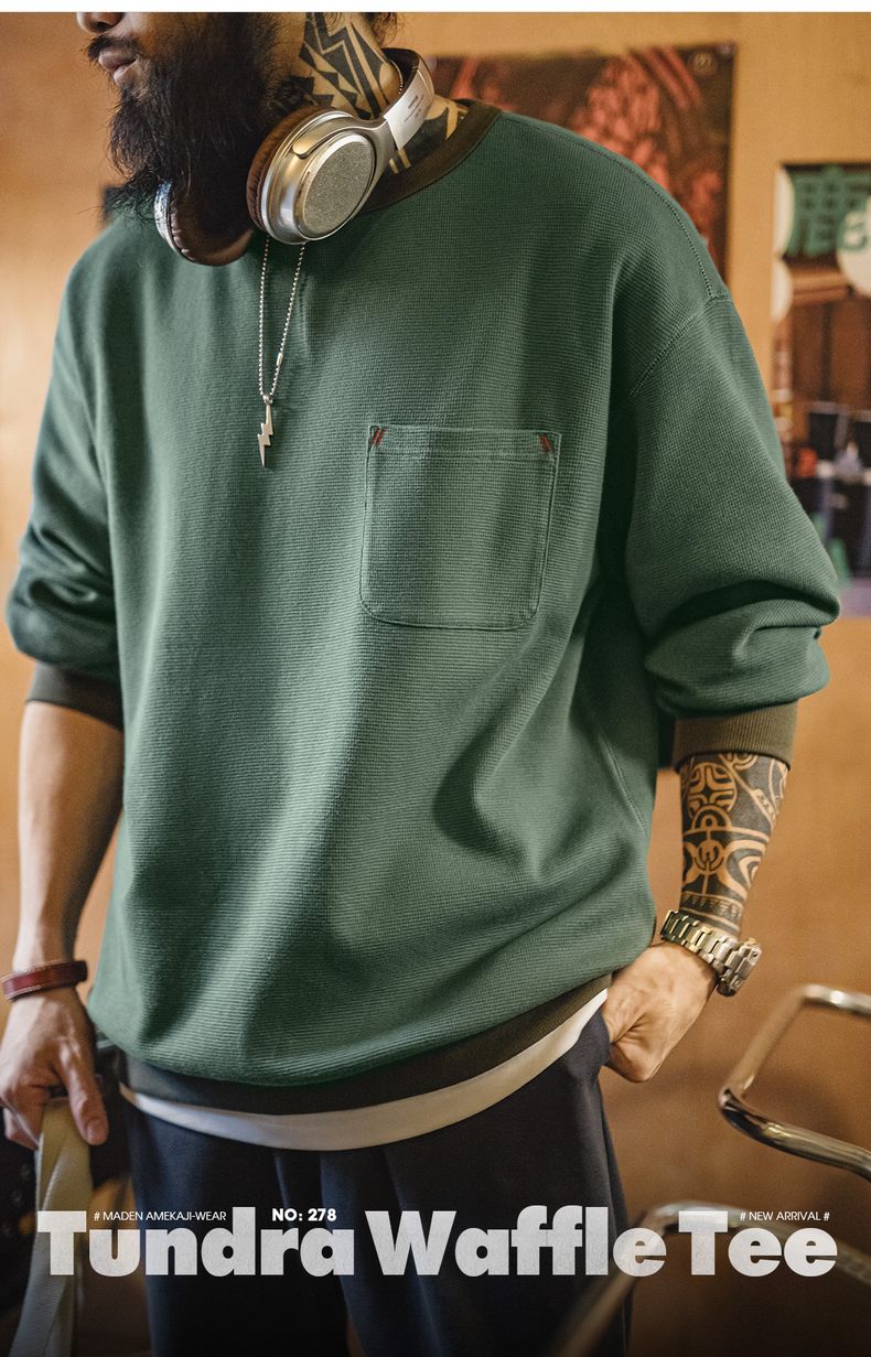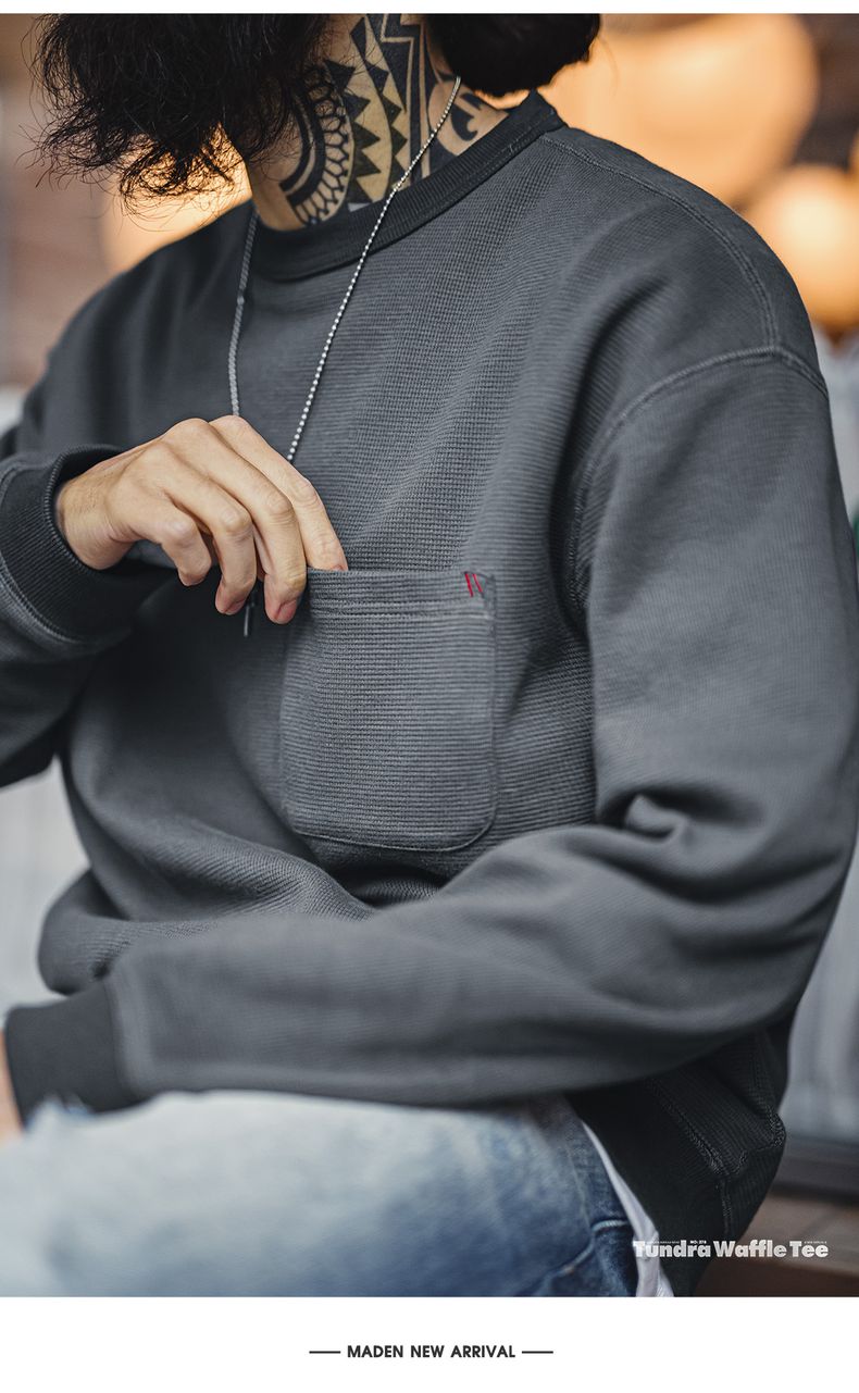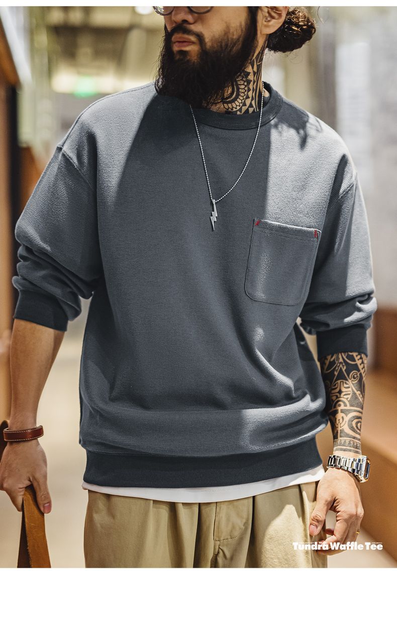 工装优选 美式休闲华夫格口袋T恤圆领套头卫衣宽松长袖上衣男春季