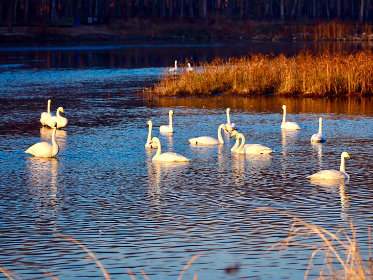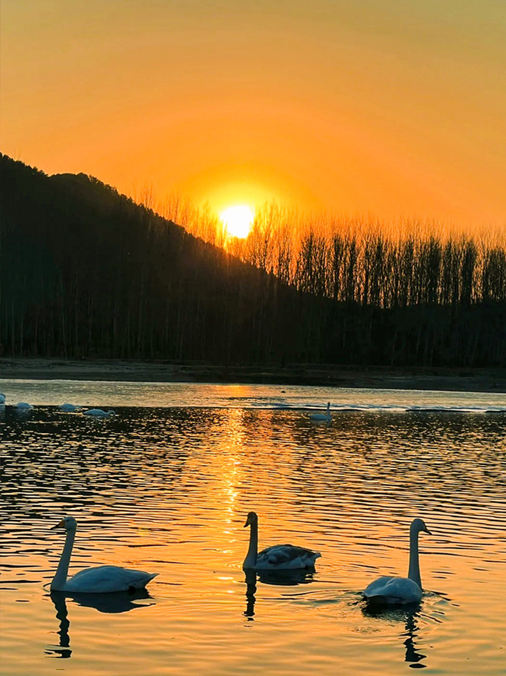 - 下午到达朝阳『红村天鹅湾』游览。到了傍晚,湖水波光粼粼,这时拍摄的天鹅、夕阳晚霞、湖水等元素结合非常出片!