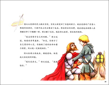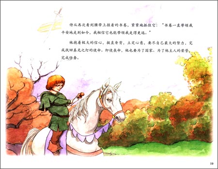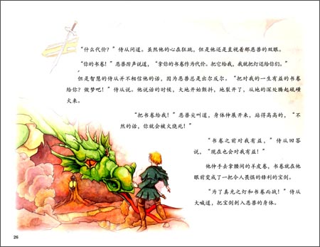 年轻侍从应国王的要求,跟随着骑士踏上了一条漫长又危险的道路。危险系数一次次增加,他最后凭借智慧的书卷胜过危险,独自与邪恶的怪兽争战,取得了胜利。伴随着侍从的旅程,孩子们也会认识到,智慧和家训的重要性。