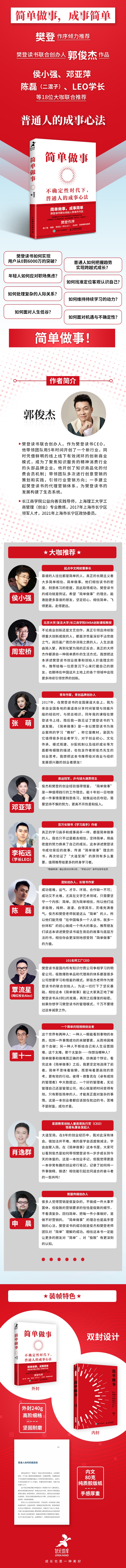 樊登读书联合*郭俊杰在这本书中,详细阐述了他作为一个普通人如何凭借“简单做事”的心态,成功创立知识付费头部企业樊登读书的经验和心得。在这本书里,不仅有创业心法、管理心得,也有他个人关于学习和成长等话题的独特见解。简单做事,成事简单。