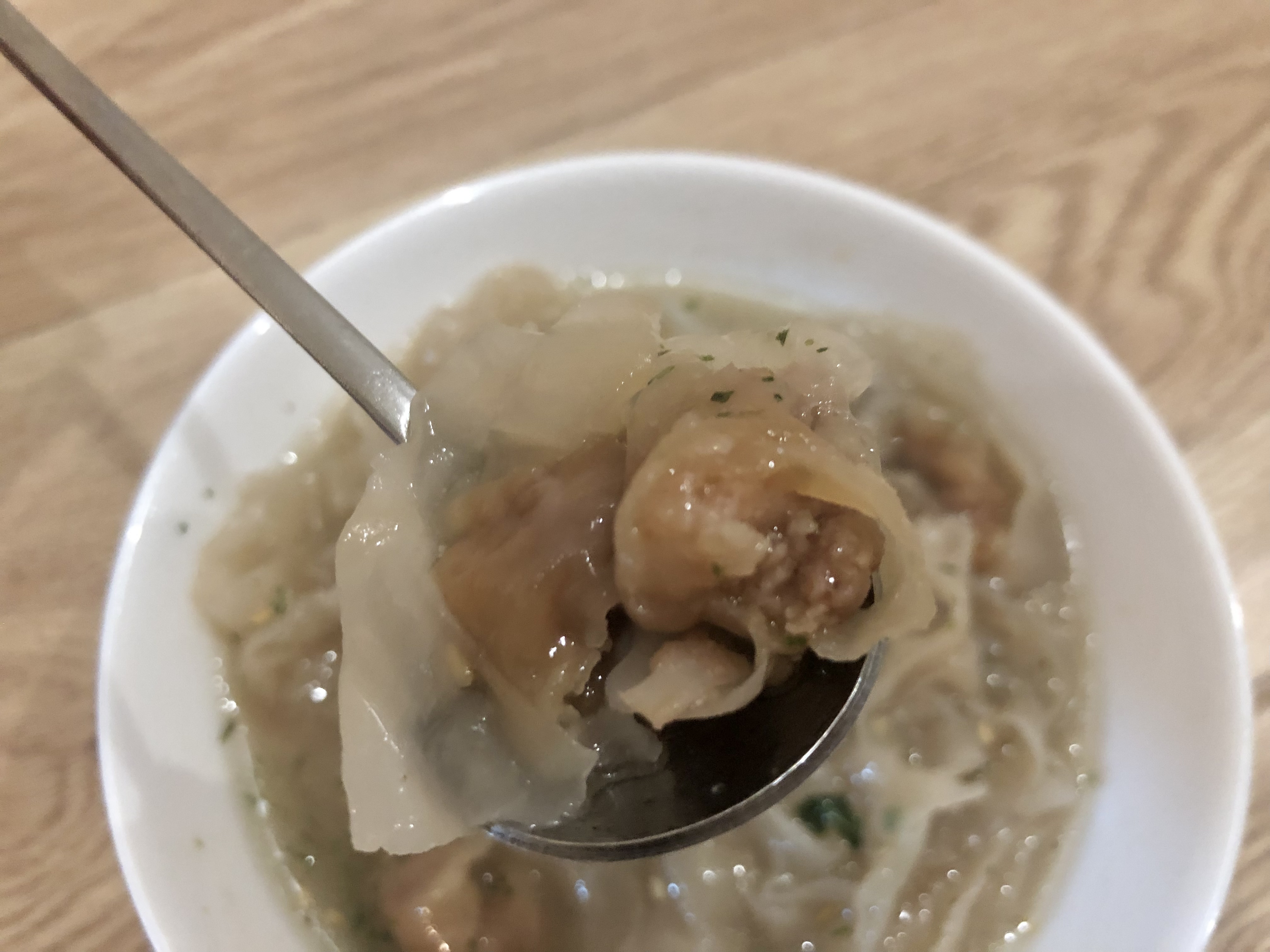 和小馄饨最大的区别是,皮也好好吃啊,带着劲道的皮,紧实的肉,真的是皮薄馅大,越吃越上瘾,乘起来皮肉不分离、不散开,皮紧紧包裹肉,晶莹剔透。