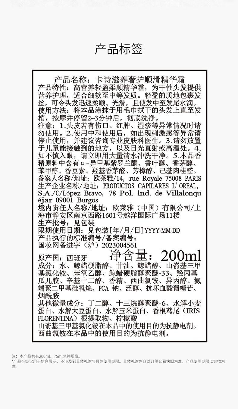 卡诗洗护套装(元气姜洗发水500ml+滋养润护蛋白乳护发素200ml)