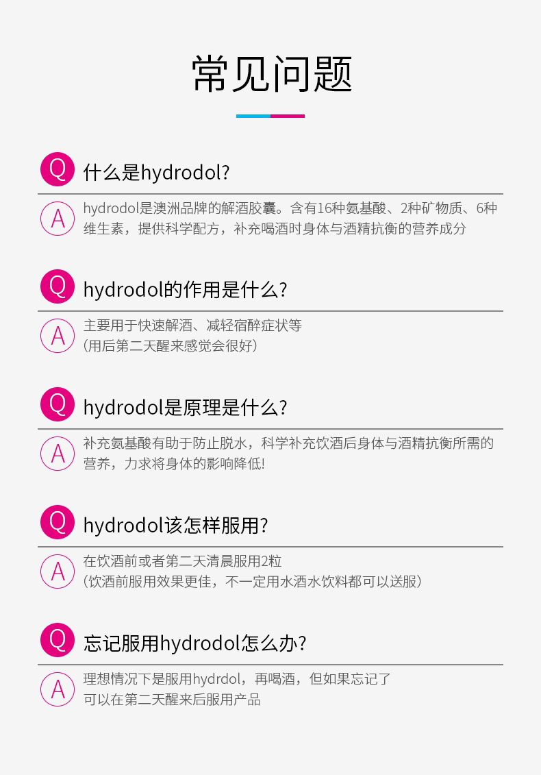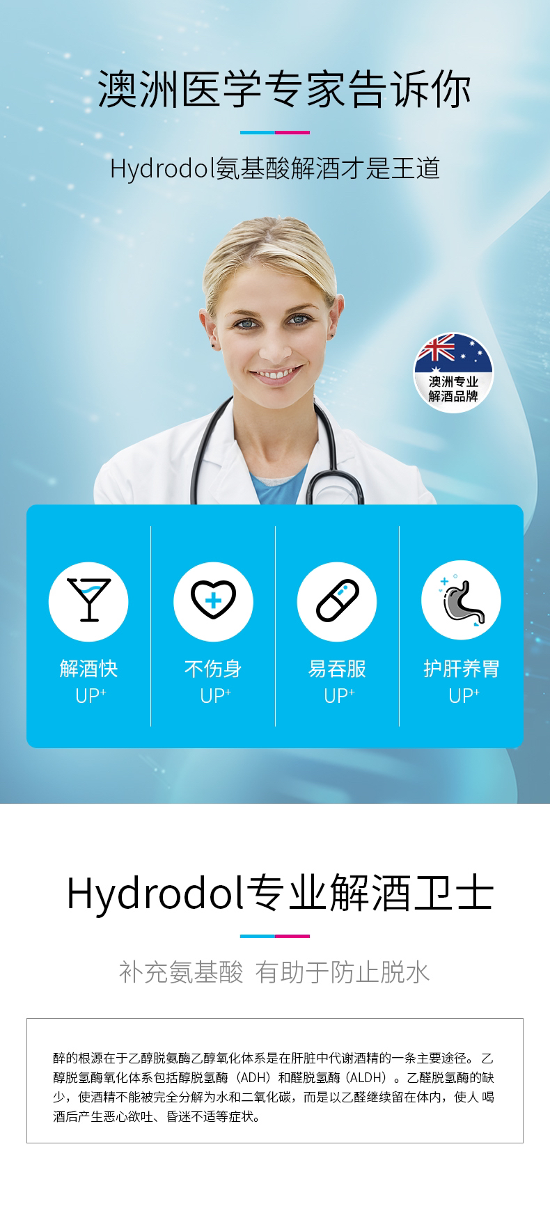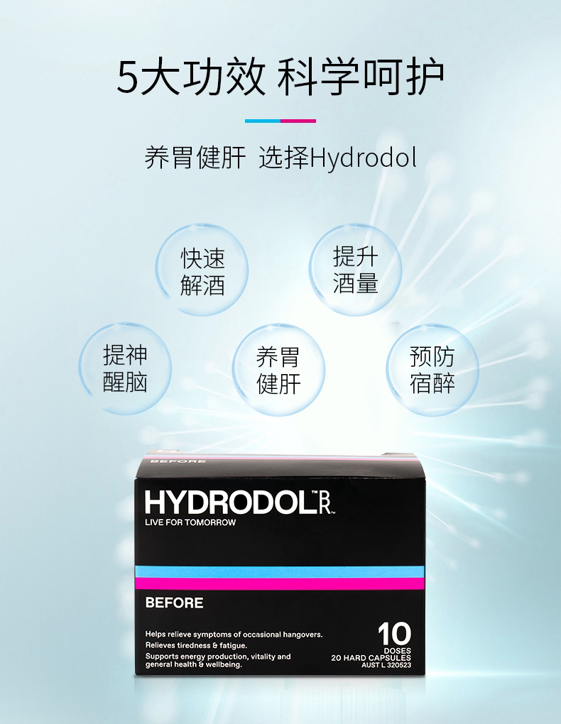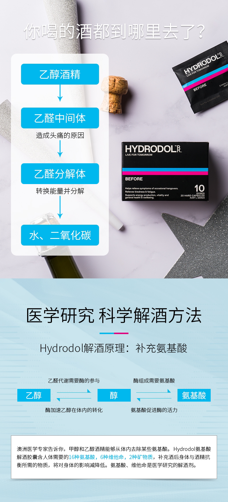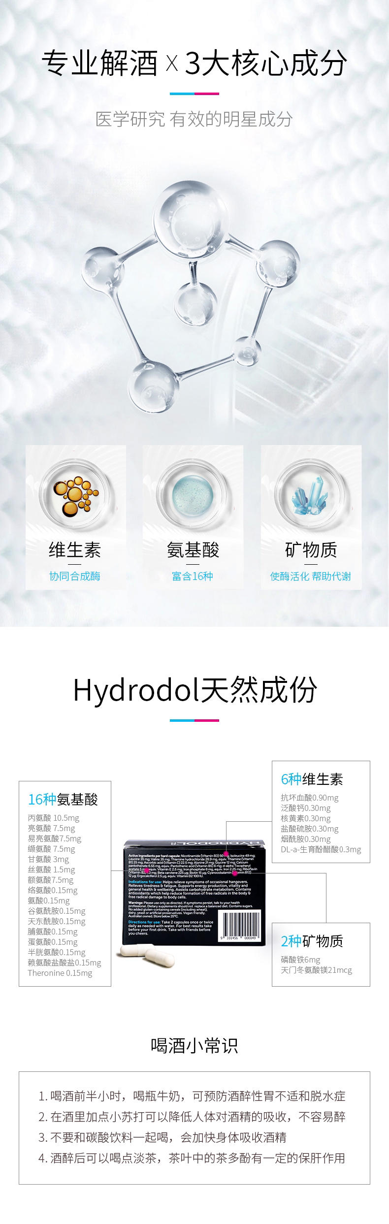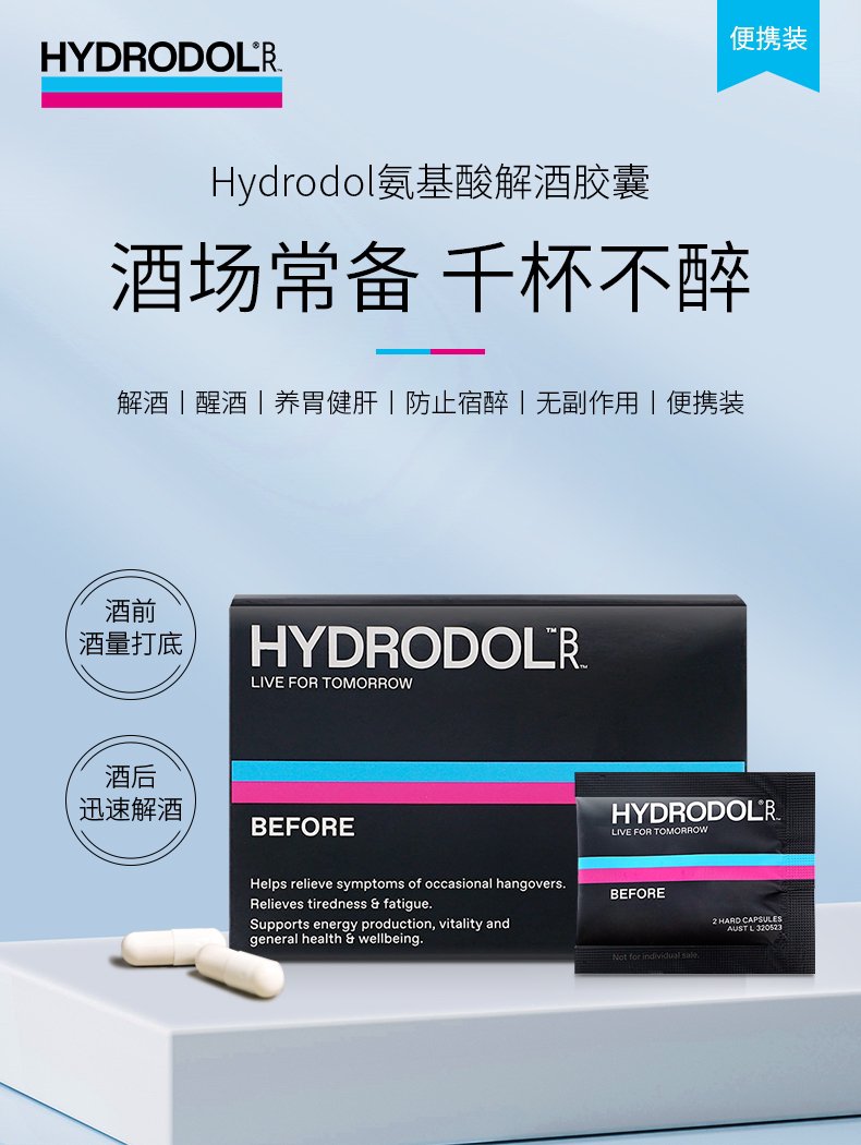 Hydrodol 宿醉解酒胶囊,含有维生素B1和B2,以及一系列氨基酸、矿物质和抗氧化剂,能够有效缓解宿醉带来的身体不适,让你在第二天又能恢复生机活力。