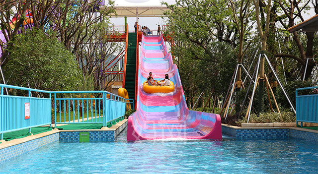 “七彩瓢虫窝”以滑梯上滑行为主,滑道内润滑水深0.2米—0.3米,滑梯的造型多为模拟自然界各类动植物外形,小朋友从滑道入口处进入滑道,在重力及润滑水的作用下沿着滑道向下滑行,最后在水中停止。本戏水池滑道主要特点是高度低,展长短,适合儿童滑行。