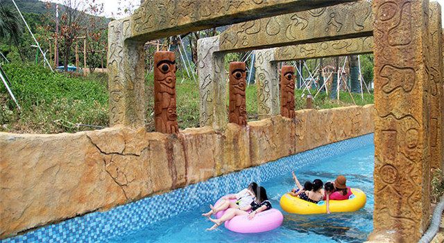 溪谷漂流河位于森林水世界中心位置,环绕“蘑菇戏水池”、“七彩瓢虫窝”、“精灵嬉水屋”而建;河道全长约380米,深约0.9米,按逆时针方向漂流,在漂流过程中会遇到层层激浪,途经小桥、假山、溶洞、各类互动喷水设施;游玩该项目需租用专用漂流圈。