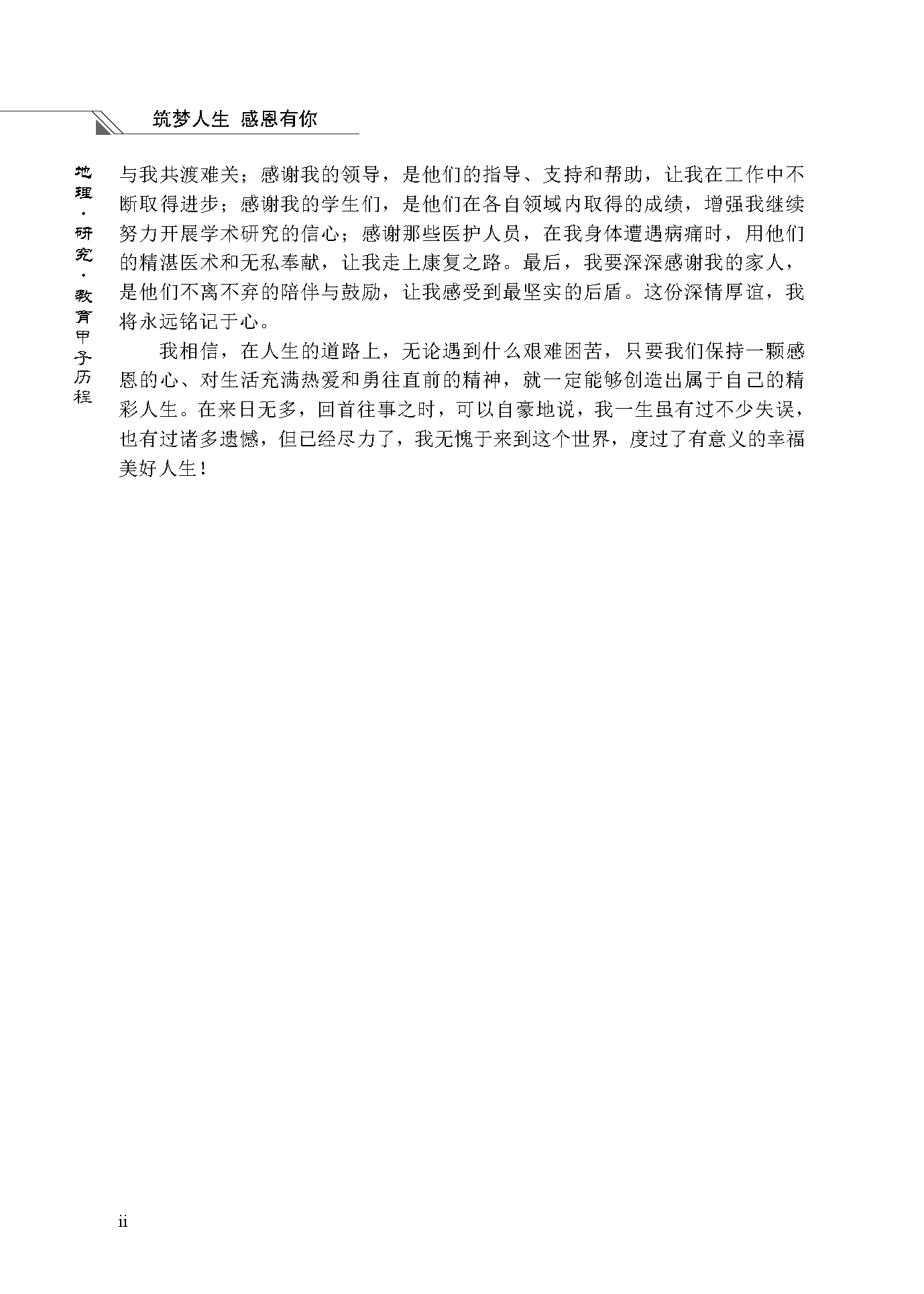 本书是许学强教授的自传,细腻记述了作者在不同时期的成长、学习、工作研究等重要事件,既为读者带来深刻启发与感悟,也真实反映了新中国成立以来城市地理学从起步、发展至丰富壮大的历程,对研究者而言是一部极具参考价值的学术史资料。全书内容丰富,以亲历者视角生动展现了一个时代的背景和发展变迁,字里行间洋溢着真挚情感与强烈感染力,合纸感悟,如临其境,给人启发。