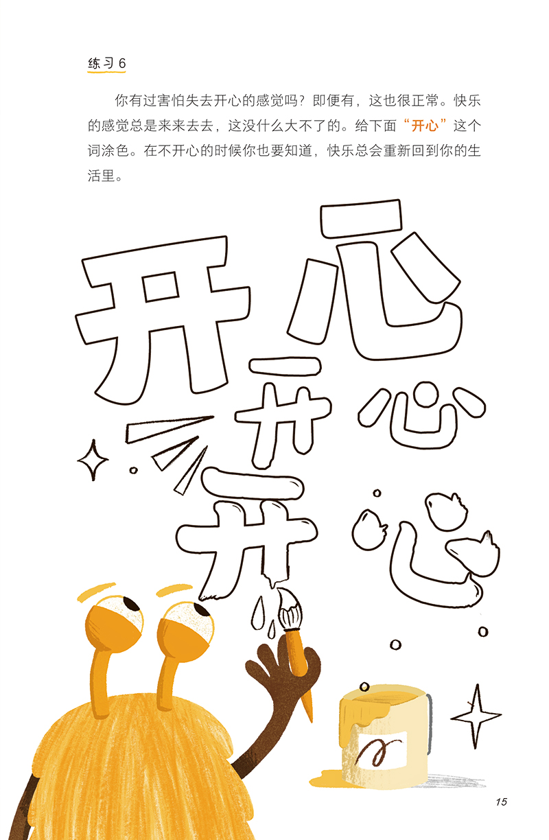 2. 通过丰富的练习探索情绪。本书通过一些具体的问题和形式多样的练习题,让孩子深入地记录、感受、探索自己的情绪,通过写一写、画一画、粘一粘、想一想、动一动,在轻松、愉悦的氛围中学习与情绪相处。