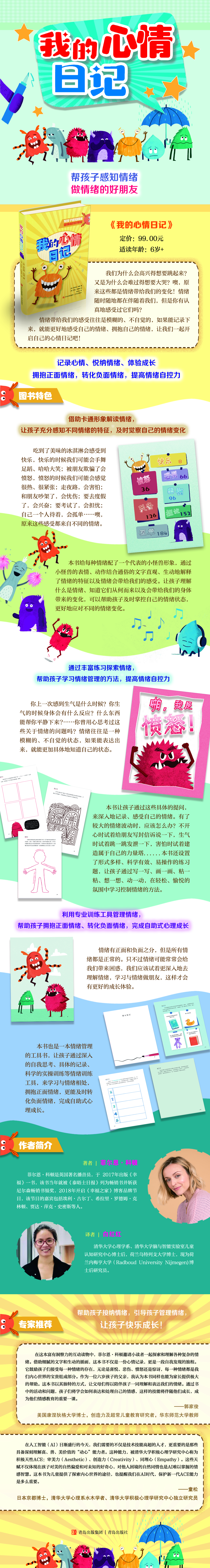 《我的心情日记》在认可情绪复杂性和抽象性的同时,用各种基于视觉、动觉、听觉和感知觉的活动,来帮助孩子去认识和表达自己的情绪。同时,相对于我们日常倾向于对情绪定性,比如“快乐”就是好的,而生气就是不好的,这本书的另外一个重要出发点是认可每一个情绪存在的必要性和合理性。这尤其能够培养孩子去感知、接受并有效地处理自己的情绪。由此,我郑重地希望把这本书介绍给所有的家庭,并希望鼓励大人们和孩子一起徜徉书中,以帮助建立亲密的亲子关系。