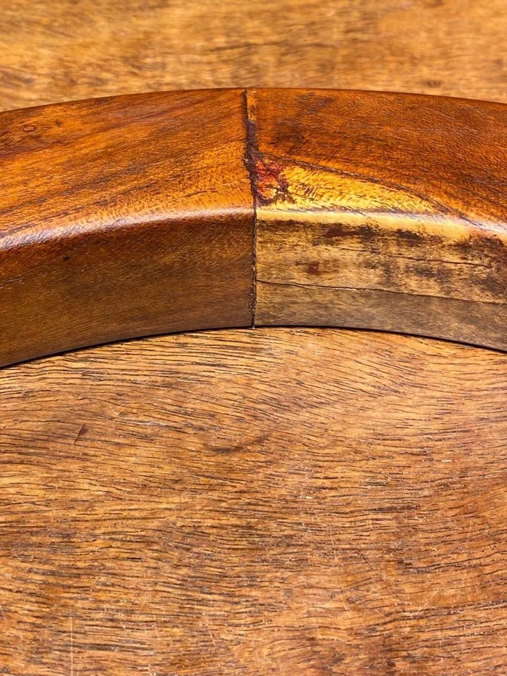 此件柞榛木环尺寸大,比重高、质地堅硬厚实,手工成型琢磨与榫卯联结成外型美观兼具之大木环,经长年使用与把玩仍然保存完好殊属难得,木身表面油润绵柔,边沿之磨损压痕自然优美,木面纹路清晰优美,以如此高贵之木料制作而成的大木环,其功能不能完全确定,整个大环无任何联接其它器物或家具的痕迹,因此应该是独立使用的器物,如书房镇纸或是室内以绳结悬挂的饰物。是富贵人家或卓越工匠之可把玩也可欣赏的实用器物。