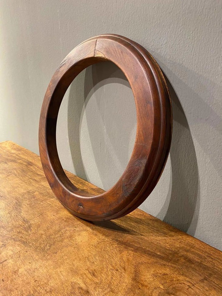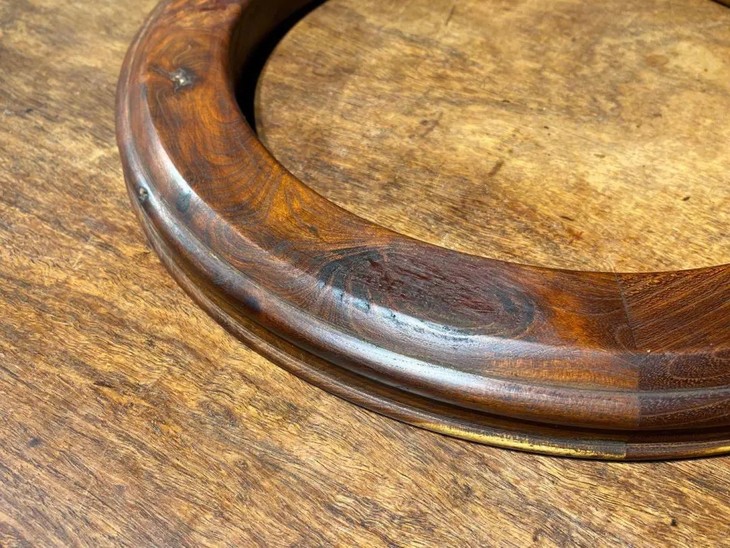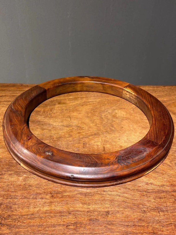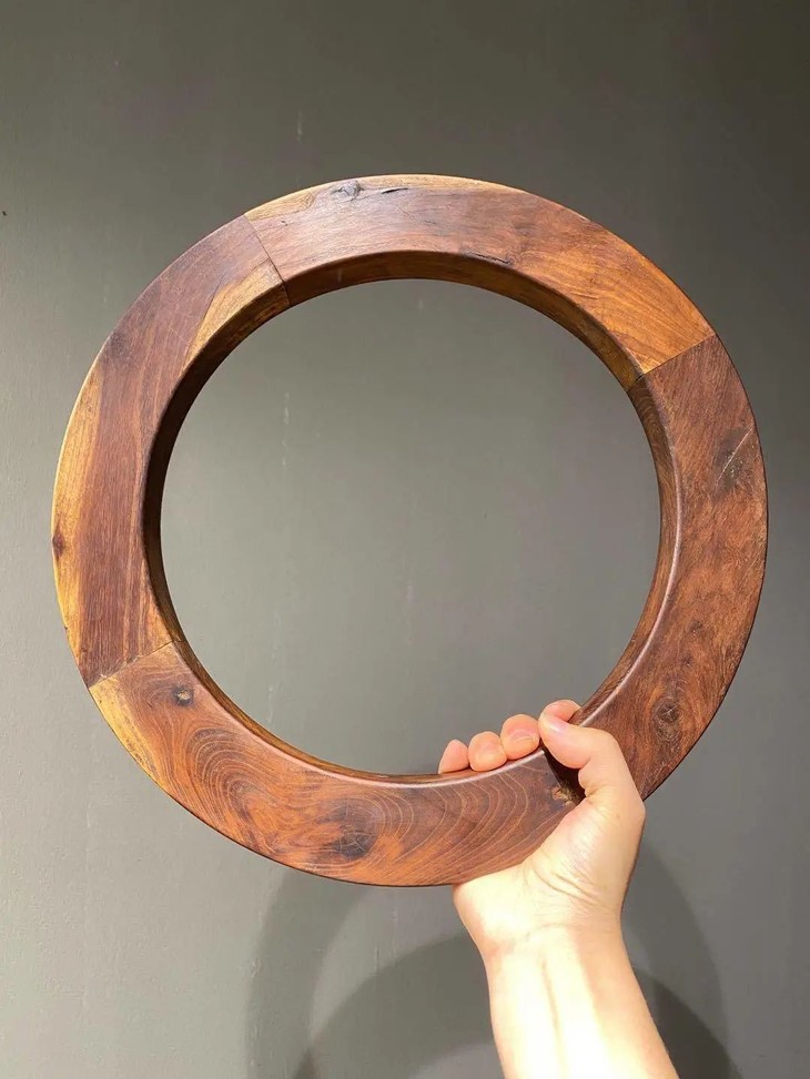 这是一件质地精良稀少的的柞榛木环形大镇纸,以质量特别好的柞榛木琢磨榫卯联结而成一件直径近四十厘米,重近一公斤的大木环,柞榛木因含丹宁年久显深褐色,色泽深遽、质地堅硬,包浆浑厚温润,纹理清晰,如行云流水,非常美丽。