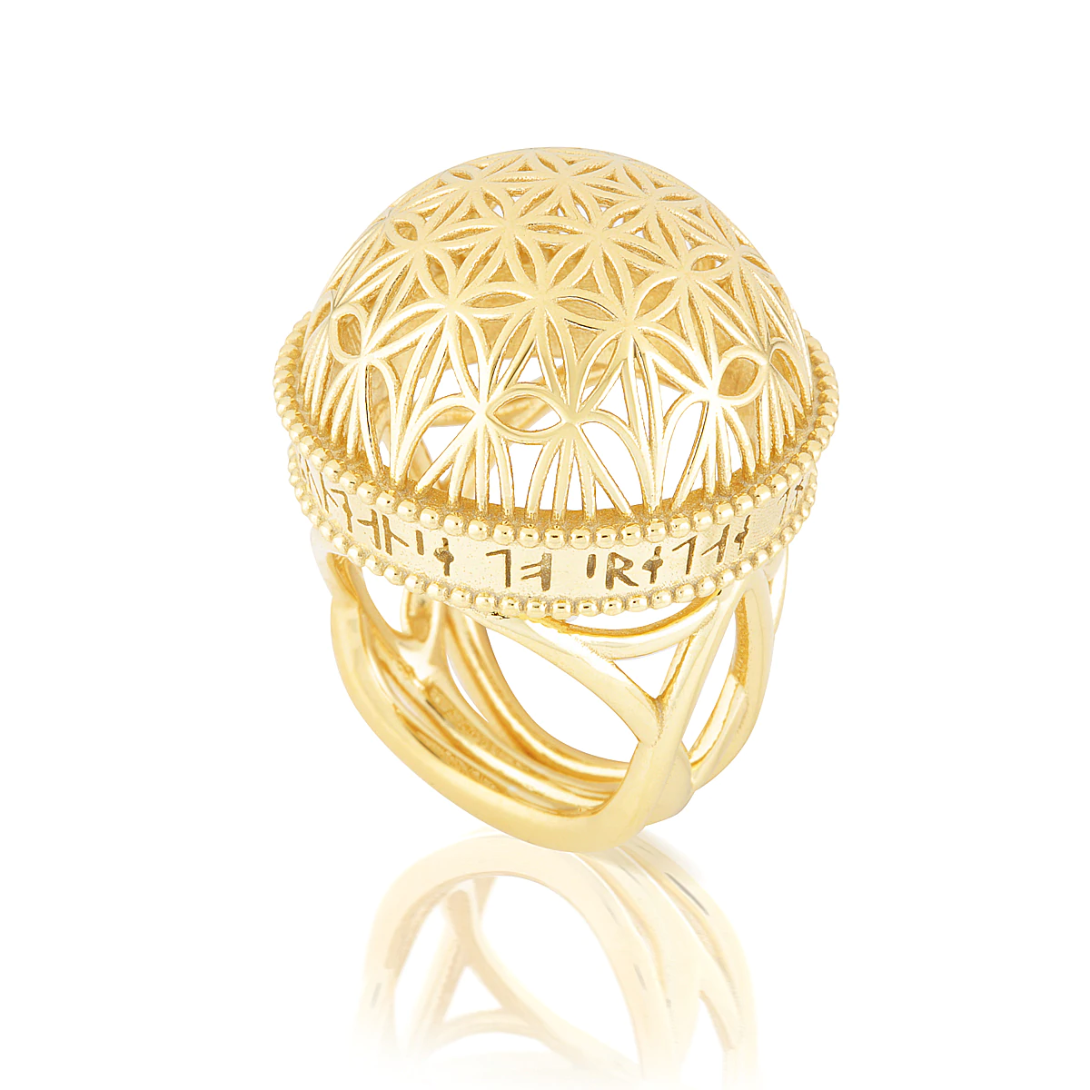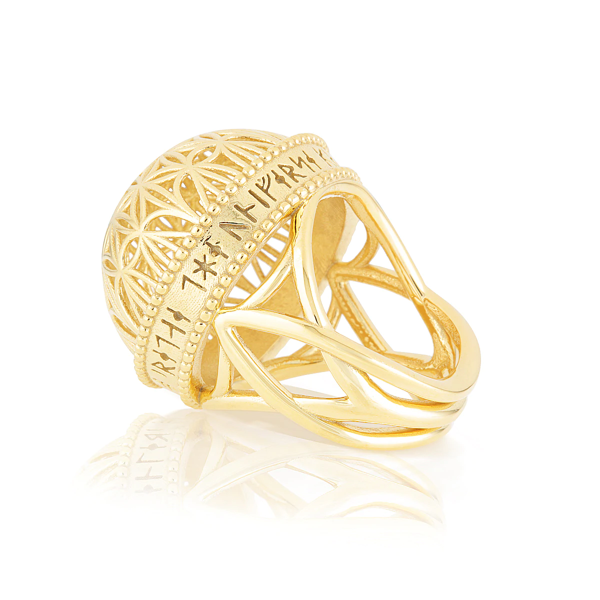 这枚以生命之花穹顶为特色的戒指是造物的神圣几何体,上面刻着“宇宙为我提供了丰富的创造”的符文铭文。它的意图是提醒我们,当我们沿着真理的道路,在追求照亮我们生活的事物时,我们将获得丰富。目标、成就感、健康和爱——这些东西是你买不到的。