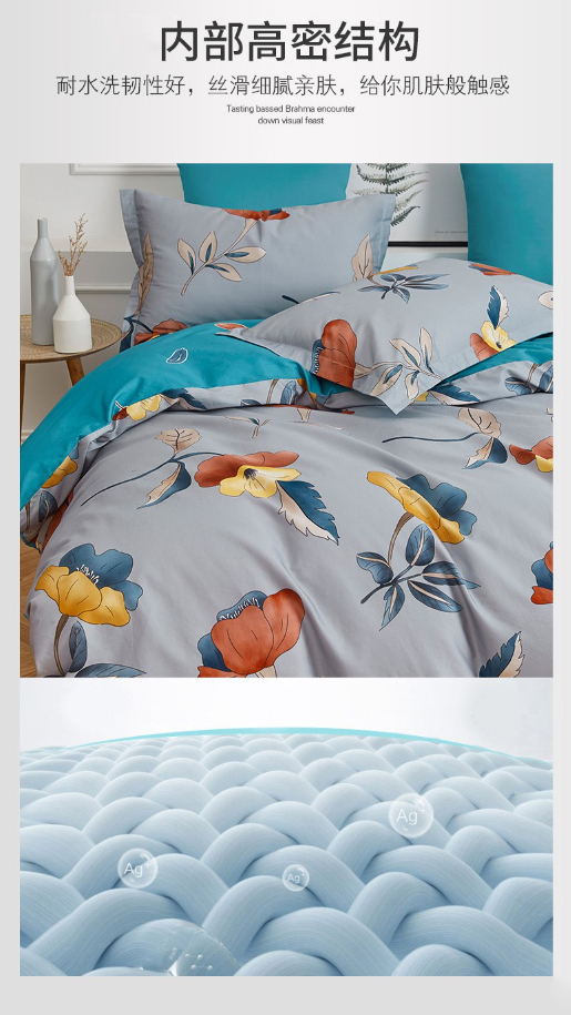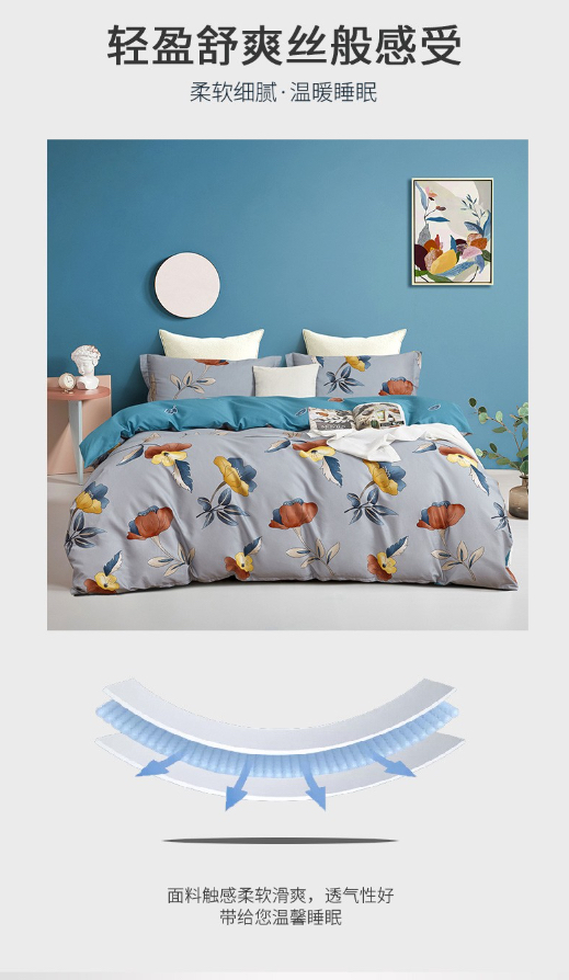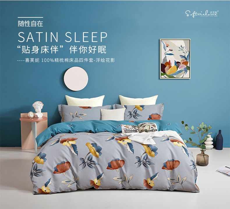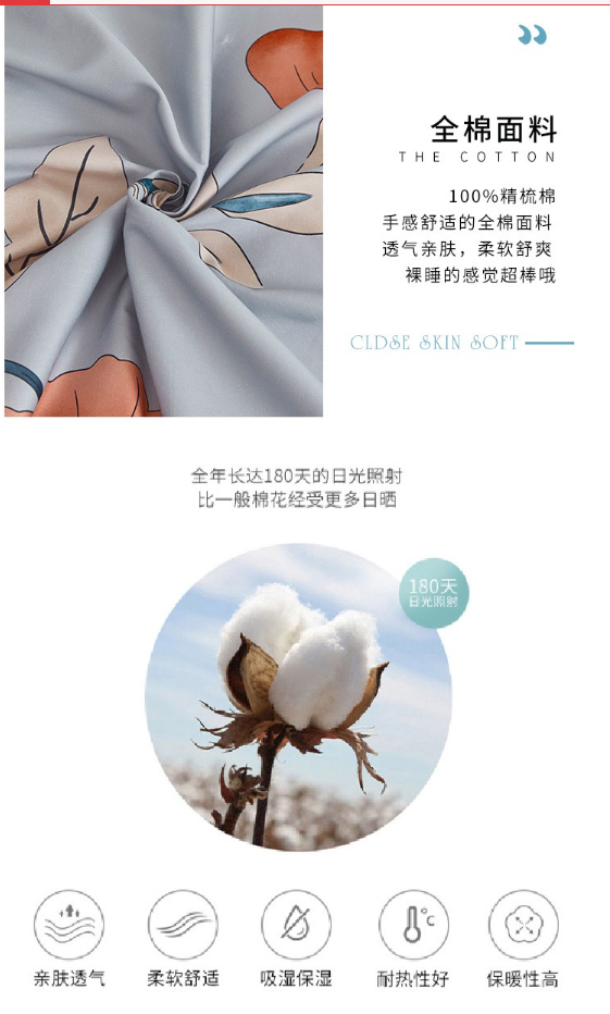 1、采用100%精梳棉,面料触感柔软滑爽。透气性好,带给您温馨睡眠。