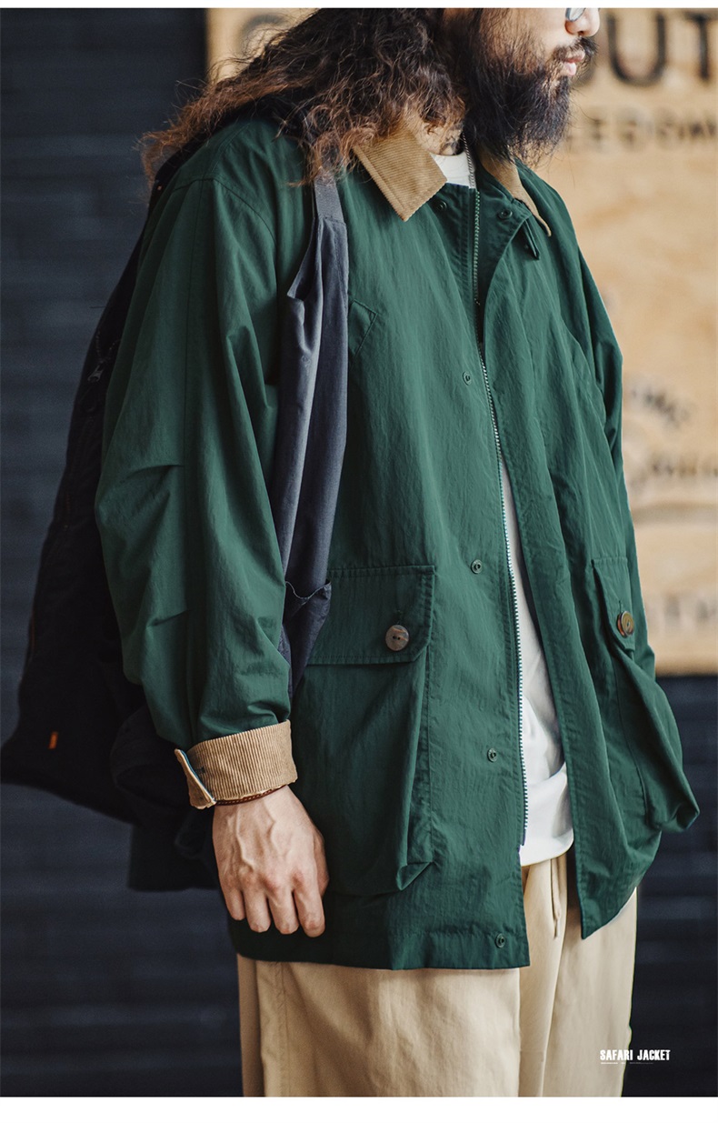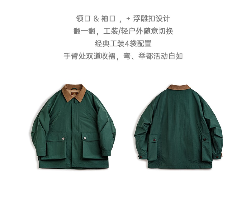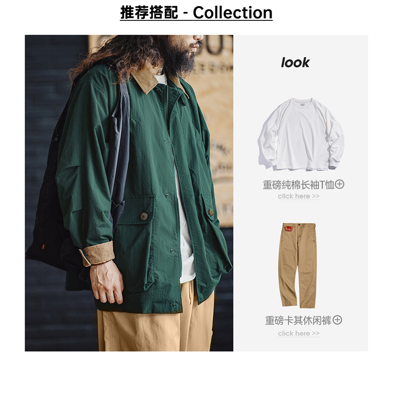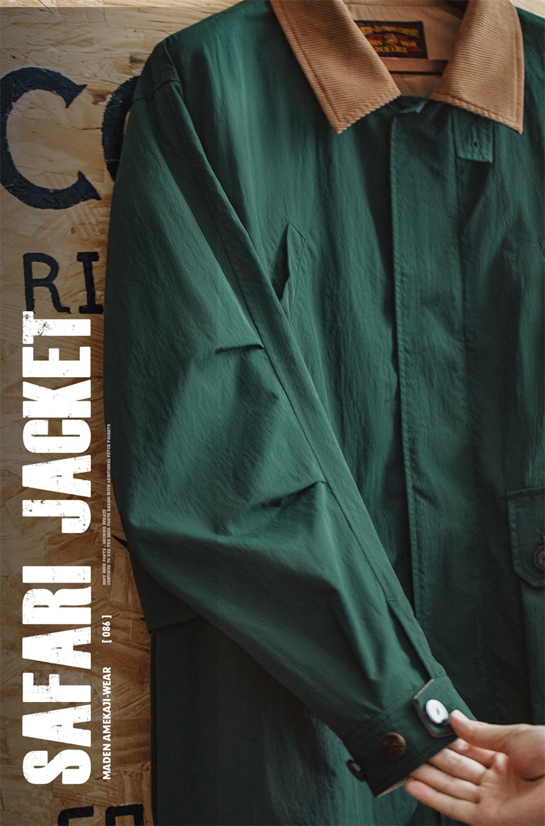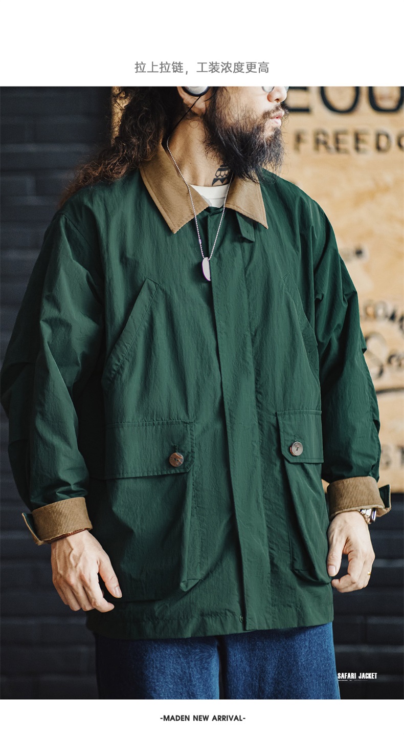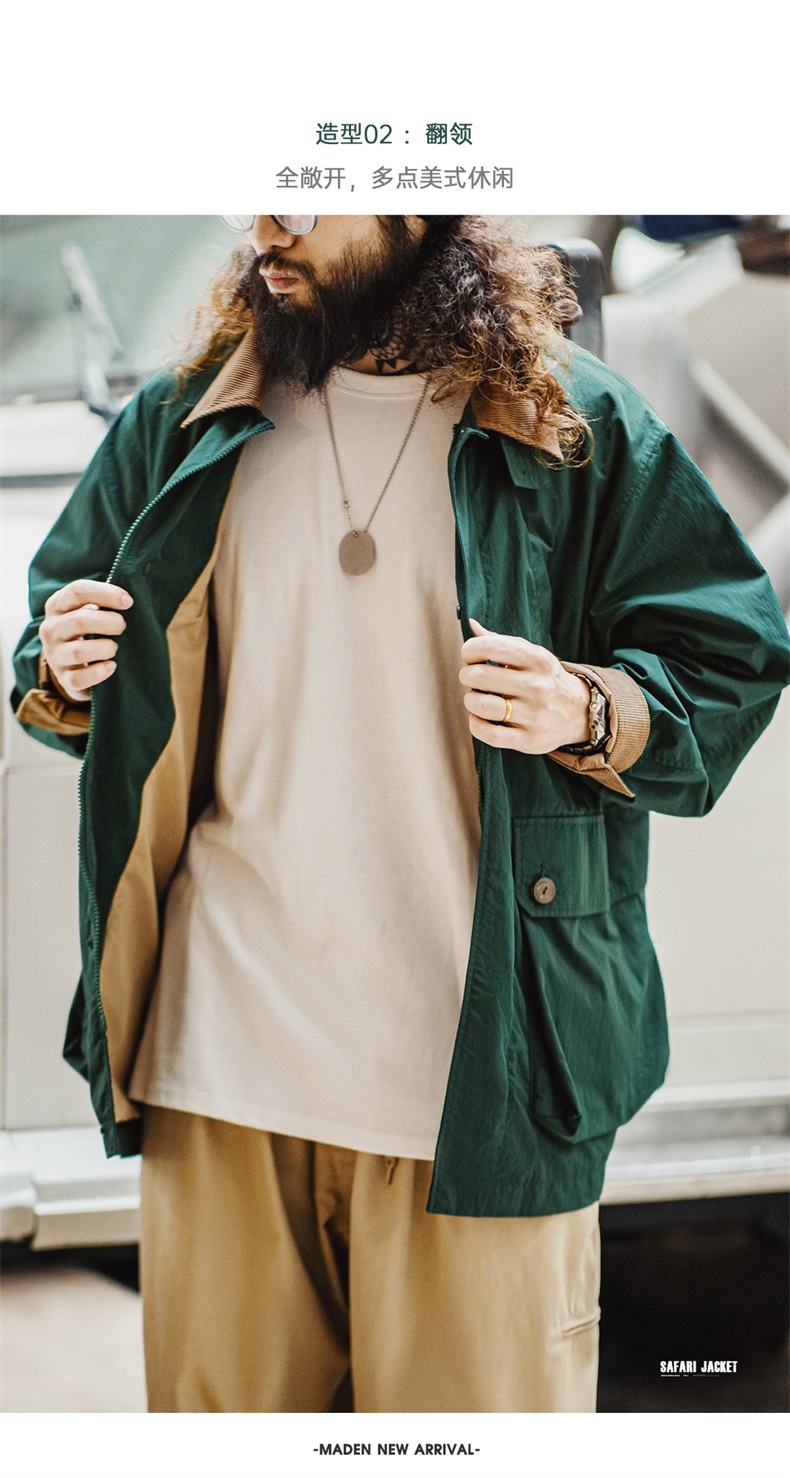 工装优选美式复古多口袋猎装夹克宽松撞色翻领中长款风衣外套男秋