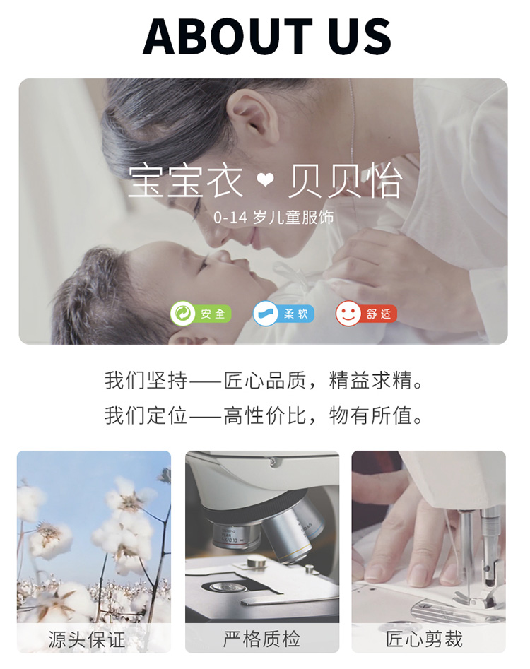 - 贝贝怡专注0-6岁婴幼儿服饰,坚持安全、柔软、舒适的产品理念,为千万中国家庭提供超高品质、安全可靠的婴幼儿服饰产品,妈妈放心,宝宝开心!