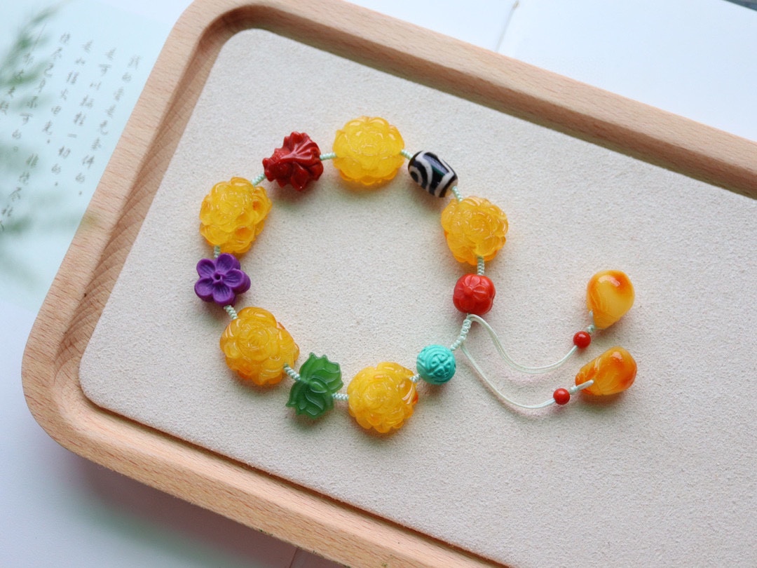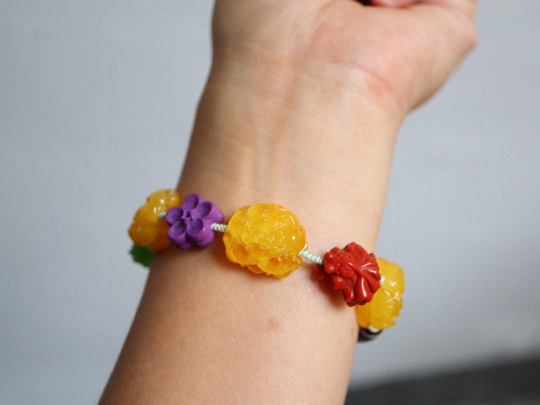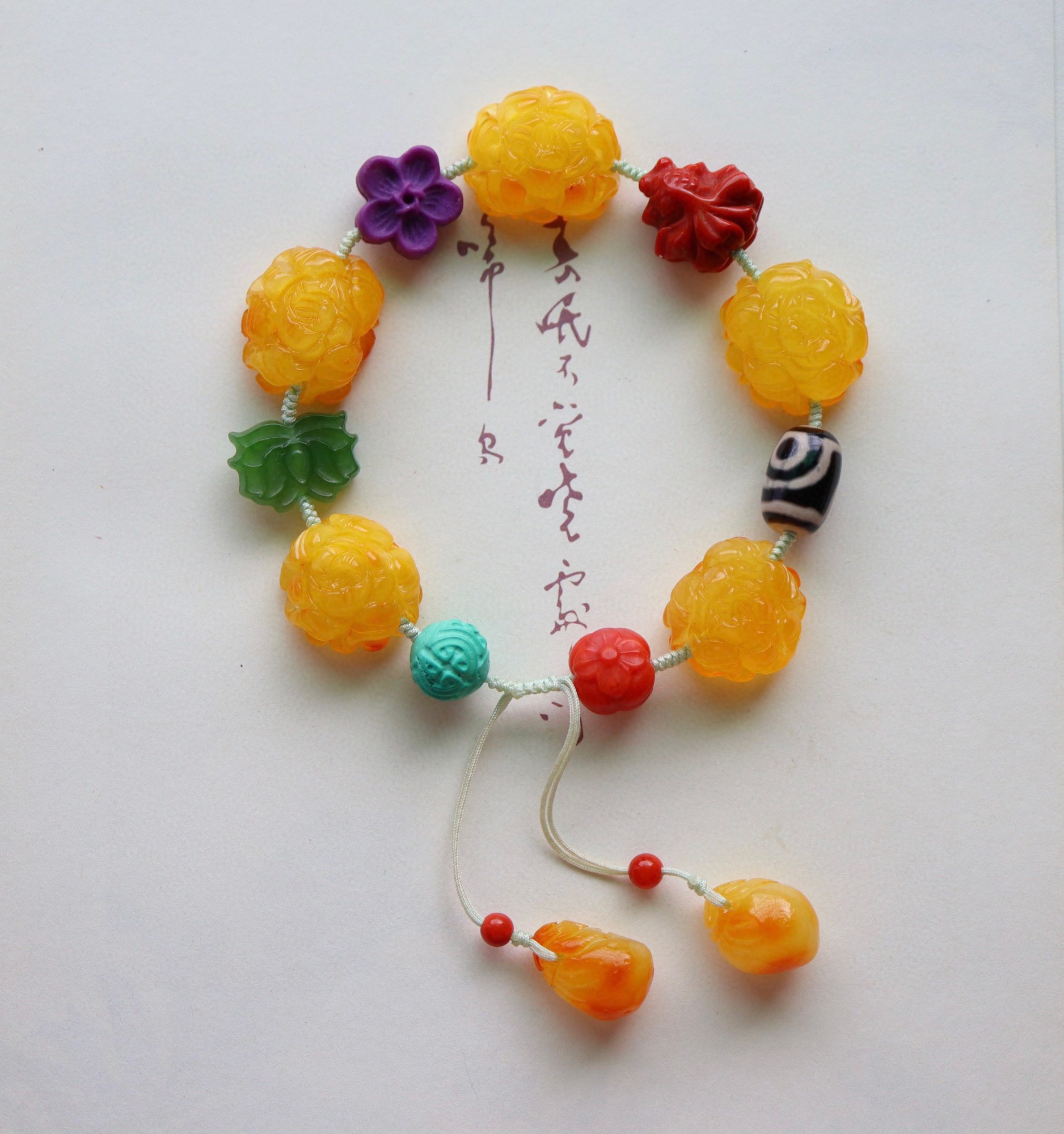 D477031 天然无优化蜜蜡雕刻牡丹花编织手串