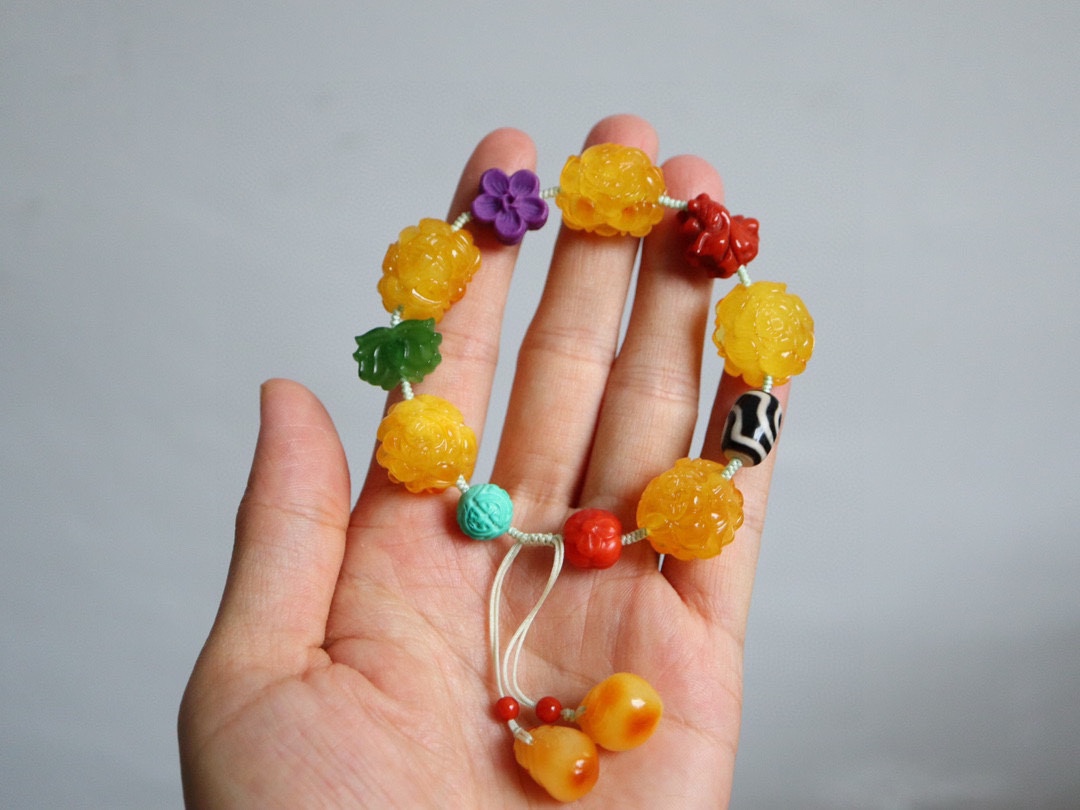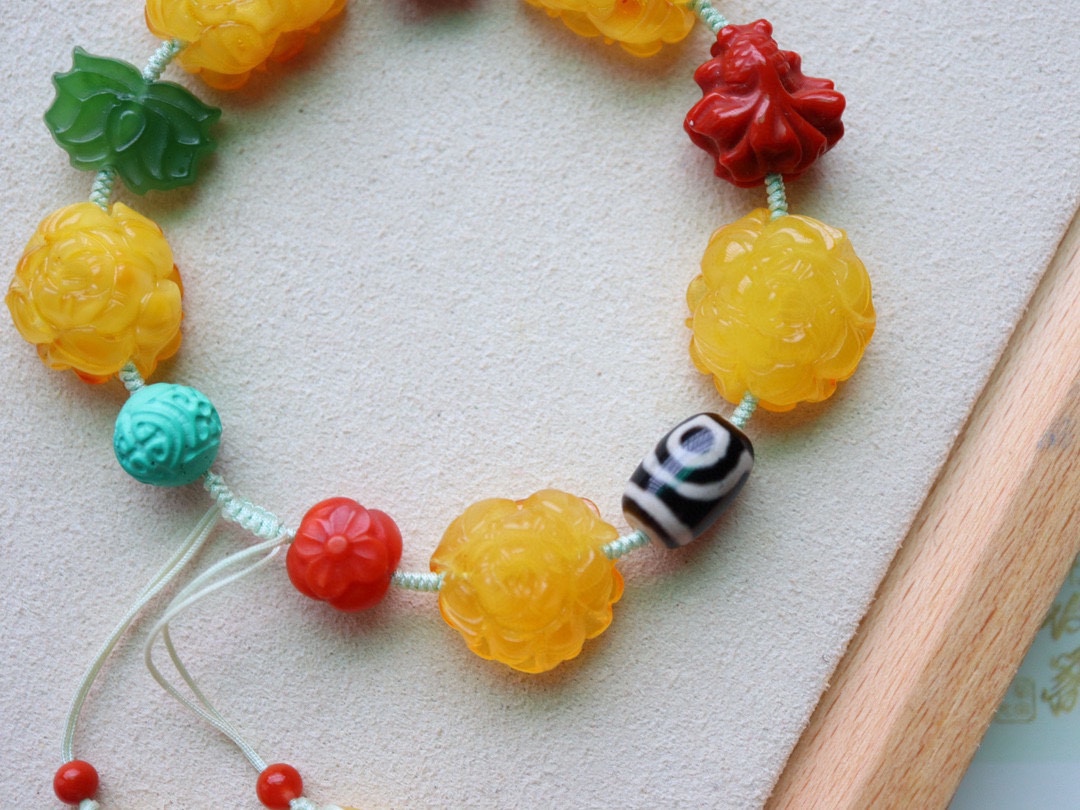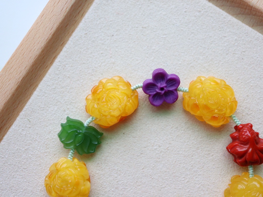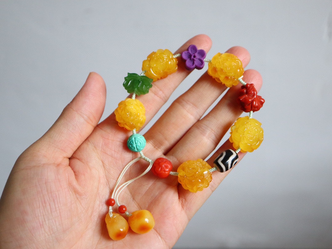 D477031 天然无优化蜜蜡雕刻牡丹花编织手串