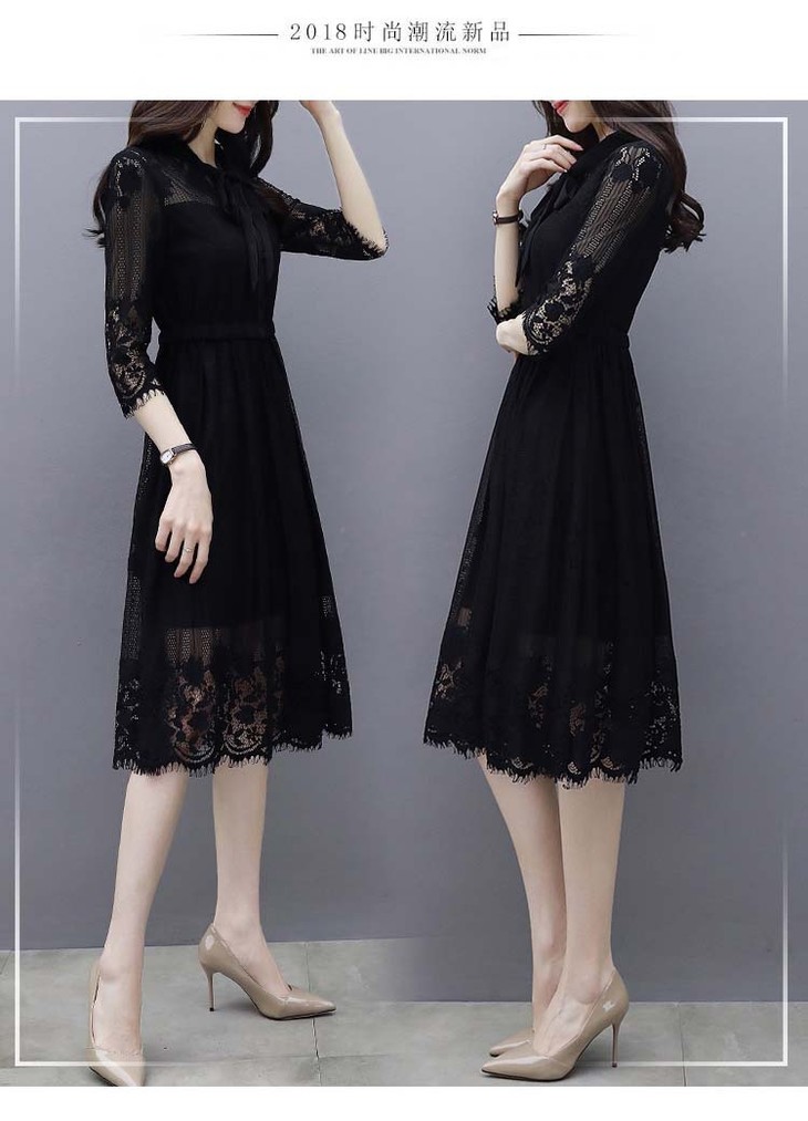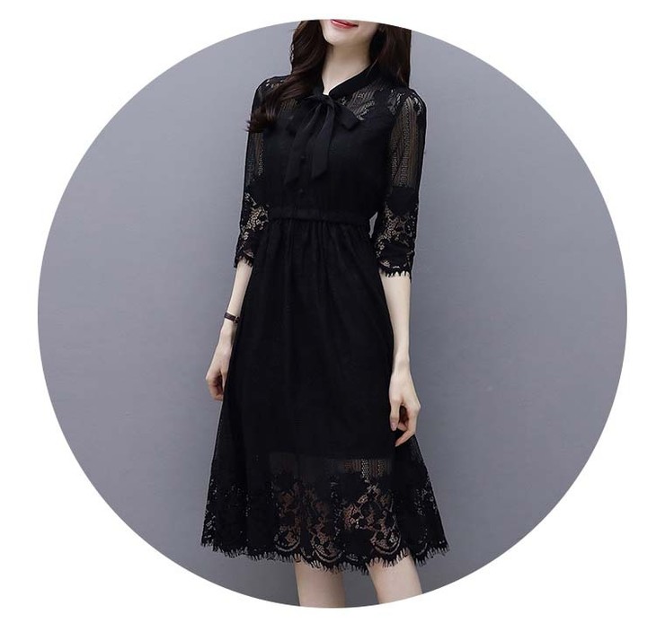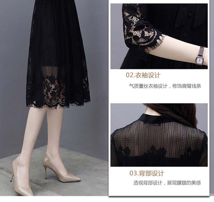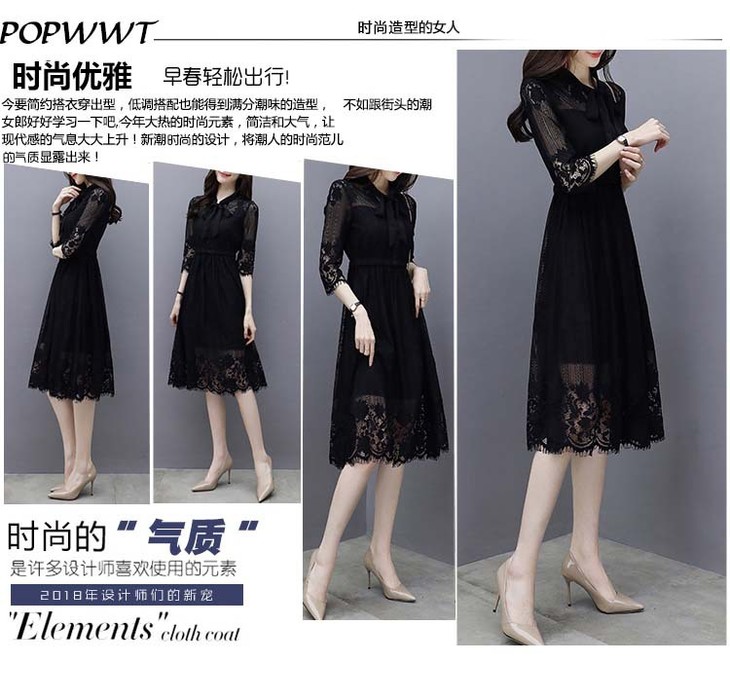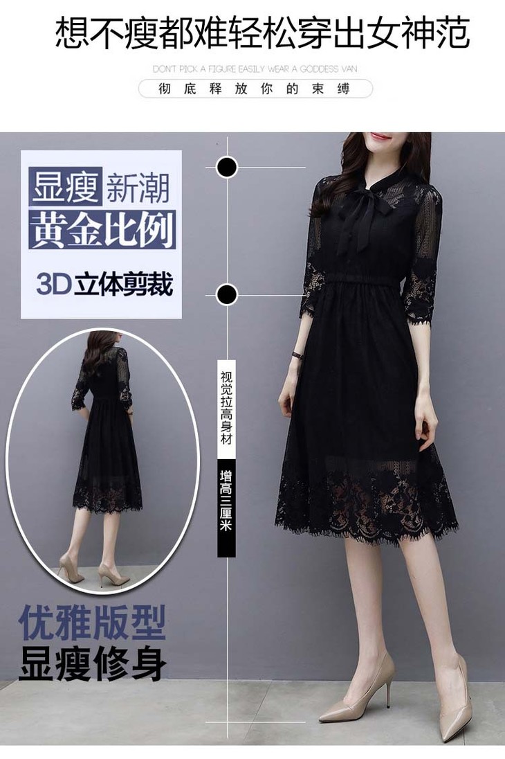 【服饰鞋包】春夏新款女装韩版七分袖蕾丝连衣裙女黑色气质显瘦中长款裙子