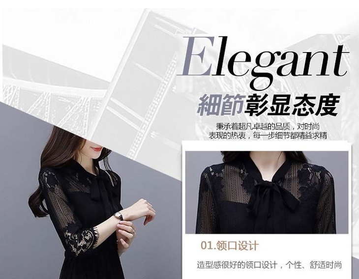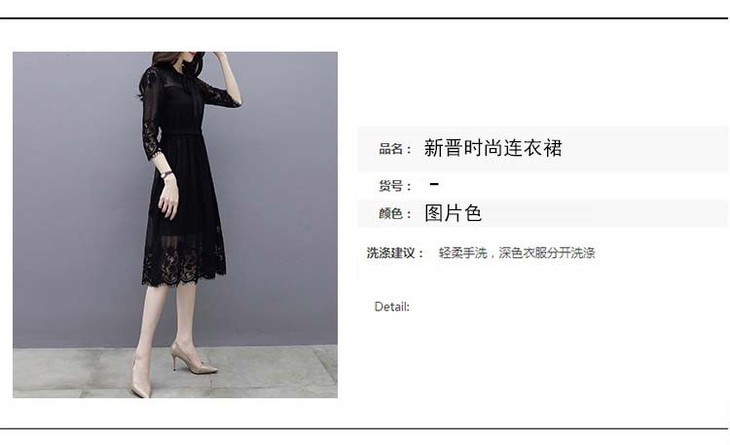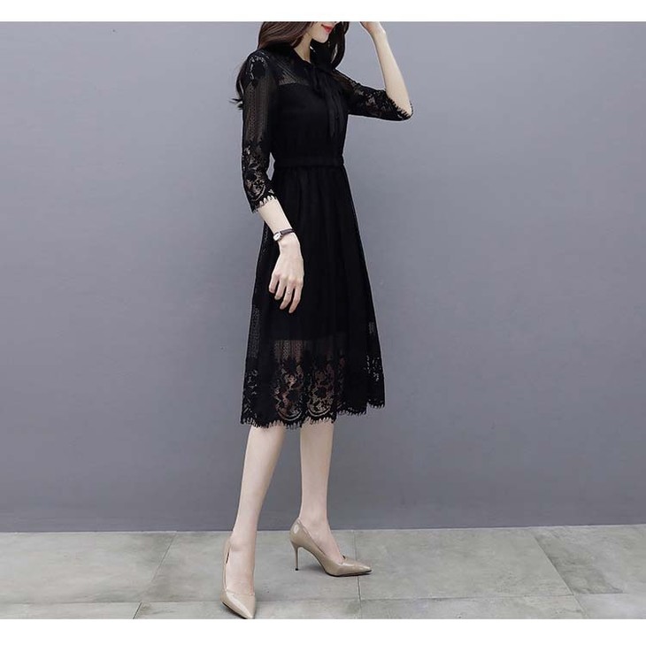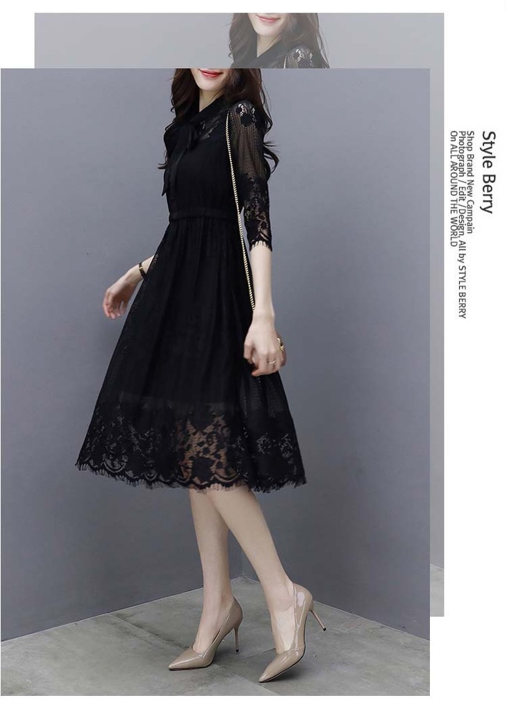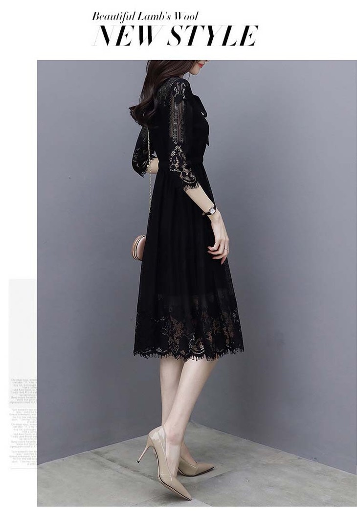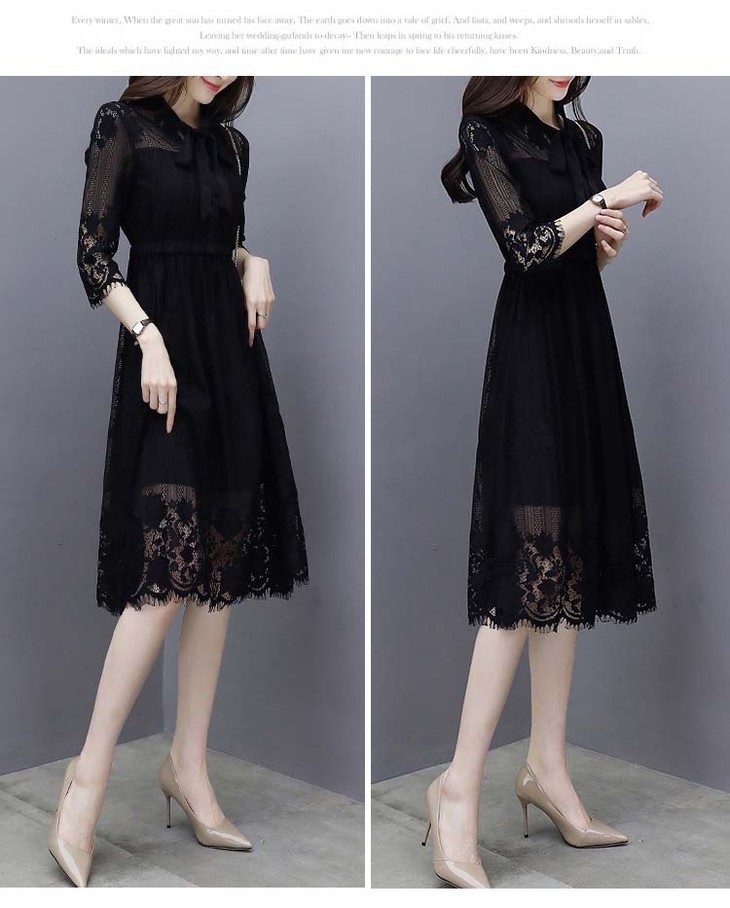 【服饰鞋包】春夏新款女装韩版七分袖蕾丝连衣裙女黑色气质显瘦中长款裙子