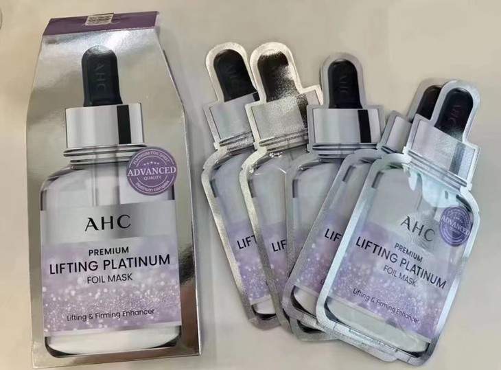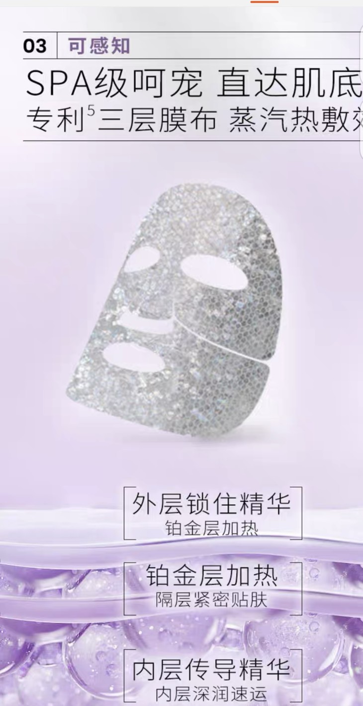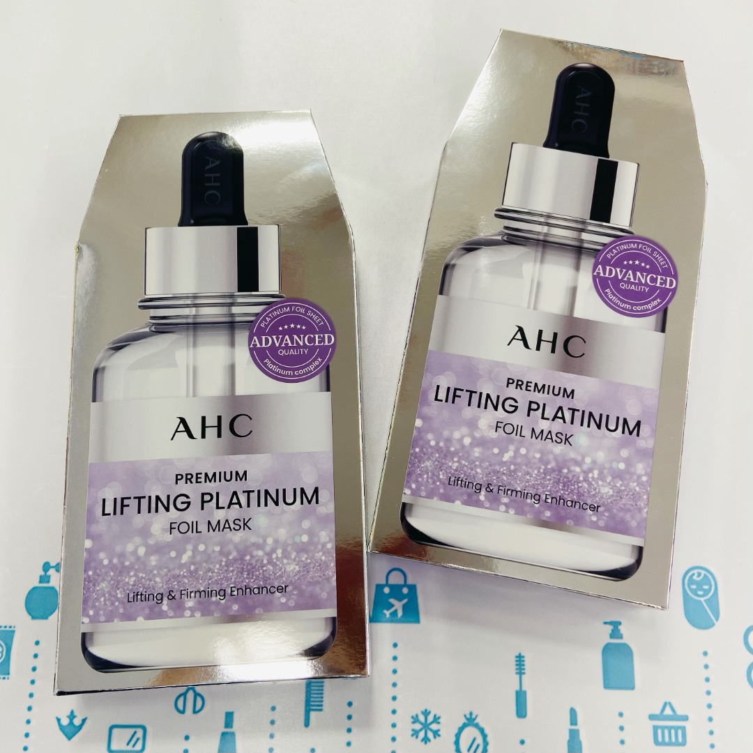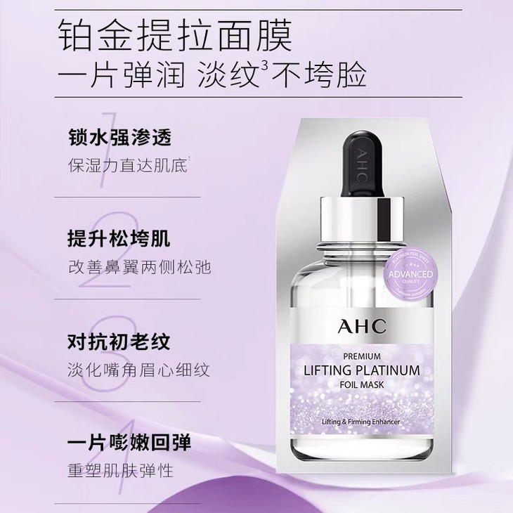 👑AHC紫色提拉铂金箔面膜5片 👍AHC-新款面膜 🙌蕴含:高纯铂金粉复合物+蓝铜胜肽+六胜肽 ✅主打:美白、提拉紧致、对抗初老纹 ✨专利三层幕布,外层锁住精华、铂金层加热、内层传导精华 💯紧密贴服,让肌肤更好吸收精华!